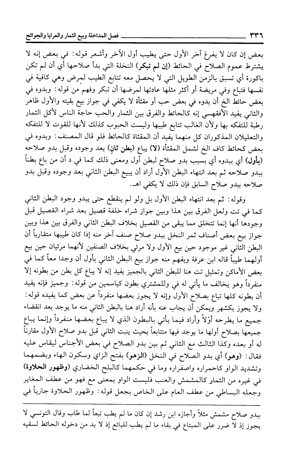 بعض إن كان لا يفرغ آخر الأول حتى يطيب أول الآخر وأشعر قوله: في بعض إنه لا يشترط عموم الصلاح في الحائط (إن لم تبكر) النخلة التي بدأ صلاحها أي أن لم تكن باكورة أي تسبق بالزمن الطويل التي لا يحصل معه تتابع الطيب لمرض وهي كافية في نفسها فتباع وفي مريضة أو أكثر مثلها عادتها لمرضها أن تبكر وفهم من قوله: وبدوه في بعض حائط الخ أن بدوه في بعض حب أو مقثأة لا يكفي في جواز بيع بقيته والأول ظاهر والثاني يفيد الأفقهسي إنه كالحائط والفرق بين الثمار والحب حاجة الناس لأكل الثمار رطبة للتفكه بها ولأن الغالب تتابع طيبها وليست الحبوب كذلك لأنها للقوت لا للتفكه والتعليلان المذكوران كل منهما يفيد أن المقثاة كالحائط فلو قال المصنف: وبدوه في بعض كحائط كاف الخ لشمل المقثأة (لا) يباع (بطن ثانٍ) بعد وجوده وقبل بدو صلاحه (بأول) أي ببدوه أي بسبب بدو صلاح لبطن أول ومعنى ذلك كما في د أن من باع بطنًا ببدو صلاحه ثم بعد انتهاء البطن الأول أراد أن يبيع البطن الثاني بعد وجوده وقبل بدو صلاحه ببدو صلاح السابق فإن ذلك لا يكفي اهـ.