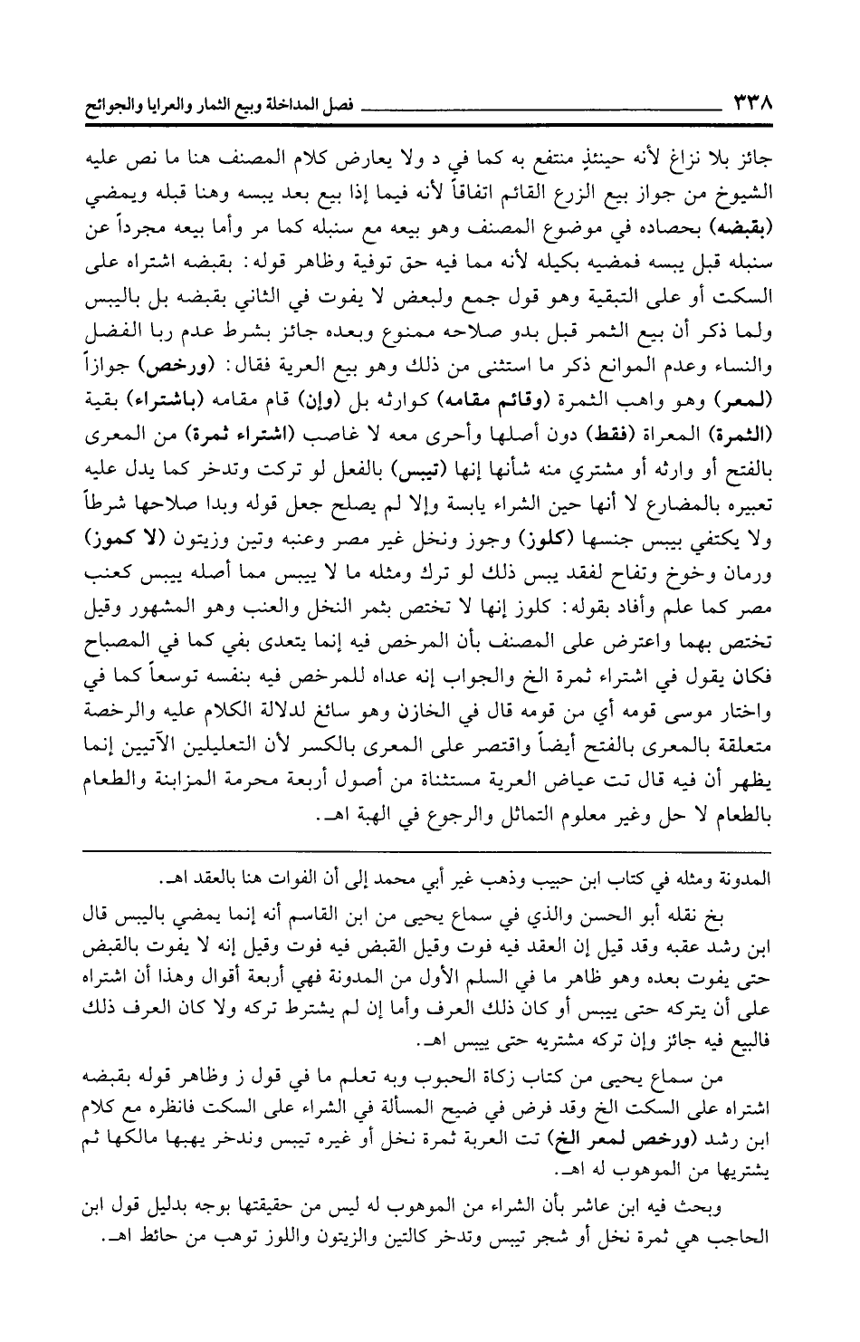 وبحث فيه ابن عاشر بأن الشراء من الموهوب له ليس من حقيقتها بوجه بدليل قول ابن الحاجب هي ثمرة نخل أو شجر تيبس وتدخر كالتين والزيتون واللوز توهب من حائط اهـ.