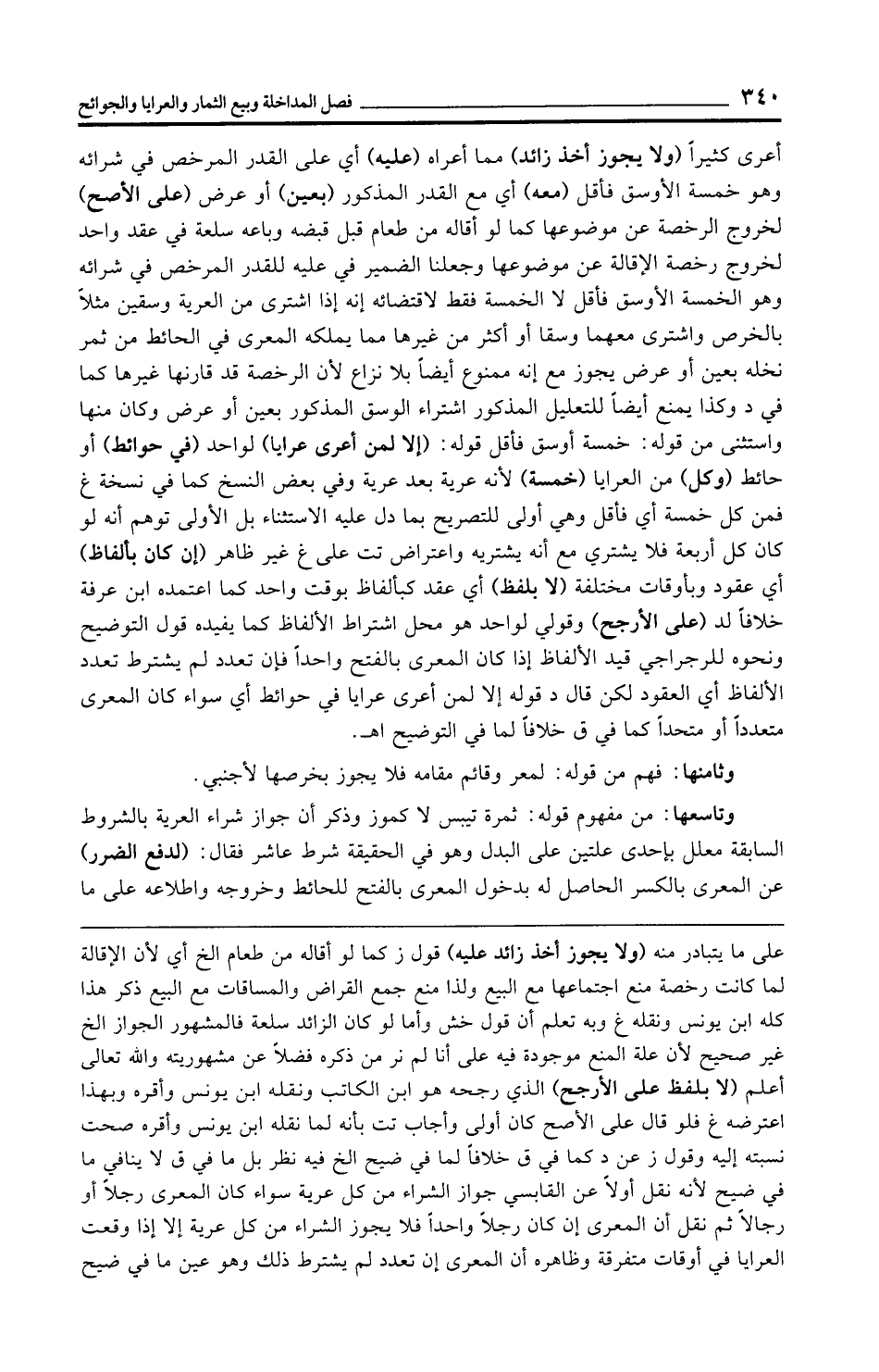 أعرى كثيرًا (ولا يجوز أخذ زائد) مما أعراه (عليه) أي على القدر المرخص في شرائه وهو خمسة الأوسق فأقل (معه) أي مع القدر المذكور (بعين) أو عرض (على الأصح) لخروج الرخصة عن موضوعها كما لو أقاله من طعام قبل قبضه وباعه سلعة في عقد واحد لخروج رخصة الإقالة عن موضوعها وجعلنا الضمير في عليه للقدر المرخص في شرائه وهو الخمسة الأوسق فأقل لا الخمسة فقط لاقتضائه إنه إذا اشترى من العرية وسقين مثلًا بالخرص واشترى معهما وسقًا أو أكثر من غيرها مما يملكه المعرى في الحائط من ثمر نخله بعين أو عرض يجوز مع إنه ممنوع أيضًا بلا نزاع لأن الرخصة قد قارنها غيرها كما في د وكذا يمنع أيضًا للتعليل المذكور اشتراء الوسق المذكور بعين أو عرض وكان منها واستثنى من قوله: خمسة أوسق فأقل قوله: (إلا لمن أعرى عرايا) لواحد (في حوائط) أو حائط (وكل) من العرايا (خمسة) لأنه عرية بعد عرية وفي بعض النسخ كما في نسخة غ فمن كل خمسة أي فأقل وهي أولى للتصريح بما دل عليه الاستثناء بل الأولى توهم أنه لو كان كل أربعة فلا يشتري مع أنه يشتريه واعتراض تت على غ غير ظاهر (إن كان بألفاظ) أي عقود وبأوقات مختلفة (لا بلفظ) أي عقد كبألفاظ بوقت واحد كما اعتمده ابن عرفة خلافًا لد (على الأرجح) وقولي لواحد هو محل اشتراط الألفاظ كما يفيده قول التوضيح ونحوه للرجراجي قيد الألفاظ إذا كان المعرى بالفتح واحدًا فإن تعدد لم يشترط تعدد الألفاظ أي العقود لكن قال د قوله إلا لمن أعرى عرايا في حوائط أي سواء كان المعرى متعددًا أو متحدًا كما في ق خلافًا لما في التوضيح اهـ.