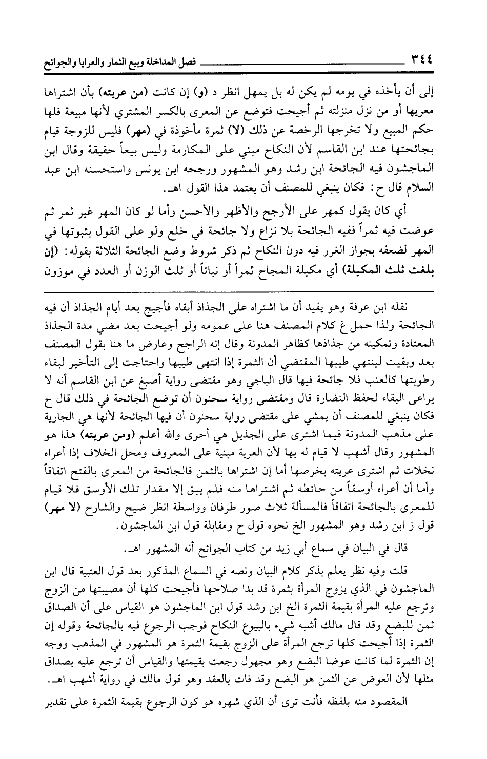 نقله ابن عرفة وهو يفيد أن ما اشتراه على الجذاذ أبقاه فأجيج بعد أيام الجذاذ أن فيه الجائحة ولذا حمل غ كلام المصنف هنا على عمومه ولو أجيحت بعد مضي مدة الجذاذ المعتادة وتمكينه من جذاذها كظاهر المدونة وقال إنه الراجح وعارض ما هنا بقول المصنف بعد وبقيت لينتهي طيبها المقتضي أن الثمرة إذا انتهى طيبها واحتاجت إلى التأخير لبقاء رطوبتها كالعنب فلا جائحة فيها قال الباجي وهو مقتضى رواية أصبغ عن ابن القاسم أنه لا يراعى البقاء لحفظ النضارة قال ومقتضى رواية سحنون أن توضع الجائحة في ذلك قال ح فكان ينبغي للمصنف أن يمشي على مقتضى رواية سحنون أن فيها الجائحة لأنها هي الجارية على مذهب المدونة فيما اشترى على الجذيل هي أحرى والله أعلم (ومن عريته) هذا هو المشهور وقال أشهب لا قيام له بها لأن العرية مبنية على المعروف ومحل الخلاف إذا أعراه نخلات ثم اشترى عريته بخرصها أما إن اشتراها بالثمن فالجائحة من المعرى بالفتح اتفاقًا وأما أن أعراه أوسقًا من حائطه ثم اشتراها منه فلم يبق إلا مقدار تلك الأوسق فلا قيام للمعرى بالجائحة اتفاقًا فالمسألة ثلاث صور طرفان وواسطة انظر ضيح والشارح (لا مهر) قول ز ابن رشد وهو المشهور الخ نحوه قول ح ومقابلة قول ابن الماجشون.