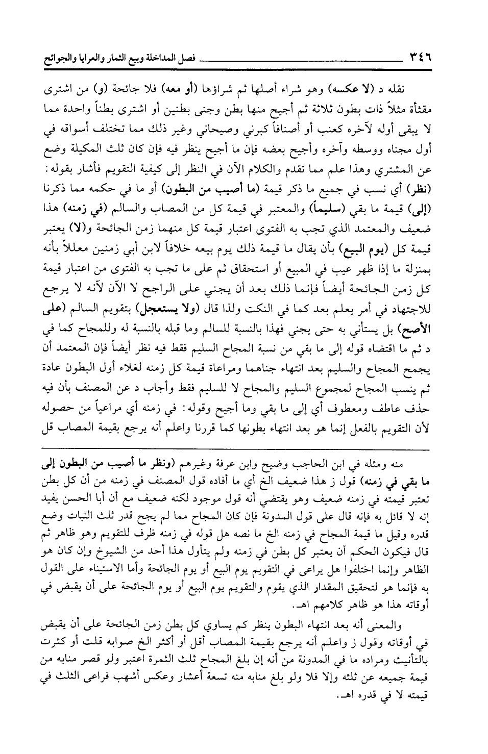 نقله د (لا عكسه) وهو شراء أصلها ثم شراؤها (أو معه) فلا جائحة (و) من اشترى مقثأة مثلًا ذات بطون ثلاثة ثم أجيح منها بطن وجنى بطنين أو اشترى بطنًا واحدة مما لا يبقى أوله لآخره كعنب أو أصنافًا كبرني وصيحاني وغير ذلك مما تختلف أسواقه في أول مجناه ووسطه وآخره وأجيح بعضه فإن ما أجيح ينظر فيه فإن كان ثلث المكيلة وضع عن المشتري وهذا علم مما تقدم والكلام الآن في النظر إلى كيفية التقويم فأشار بقوله: (نظر) أي نسب في جميع ما ذكر قيمة (ما أصيب من البطون) أو ما في حكمه مما ذكرنا (إلى) قيمة ما بقي (سليمًا) والمعتبر في قيمة كل من المصاب والسالم (في زمنه) هذا ضعيف والمعتمد الذي تجب به الفتوى اعتبار قيمة كل منهما زمن الجائحة و (لا) يعتبر قيمة كل (يوم البيع) بأن يقال ما قيمة ذلك يوم بيعه خلافًا لابن أبي زمنين معللًا بأنه بمنزلة ما إذا ظهر عيب في المبيع أو استحقاق ثم على ما تجب به الفتوى من اعتبار قيمة كل زمن الجائحة أيضًا فإنما ذلك بعد أن يجني على الراجح لا الآن لأنه لا يرجع للاجتهاد في أمر يعلم بعد كما في النكت ولذا قال (ولا يستعجل) بتقويم السالم (على الأصح) بل يستأني به حتى يجني فهذا بالنسبة للسالم وما قبله بالنسبة له وللمجاح كما في د ثم ما اقتضاه قوله إلى ما بقي من نسبة المجاح السليم فقط فيه نظر أيضًا فإن المعتمد أن يجمح المجاح والسليم بعد انتهاء جناهما ومراعاة قيمة كل زمنه لغلاء أول البطون عادة ثم ينسب المجاح لمجموع السليم والمجاح لا للسليم فقط وأجاب د عن المصنف بأن فيه حذف عاطف ومعطوف أي إلى ما بقي وما أجيح وقوله: في زمنه أي مراعيًا من حصوله لأن التقويم بالفعل إنما هو بعد انتهاء بطونها كما قررنا واعلم أنه يرجع بقيمة المصاب قل