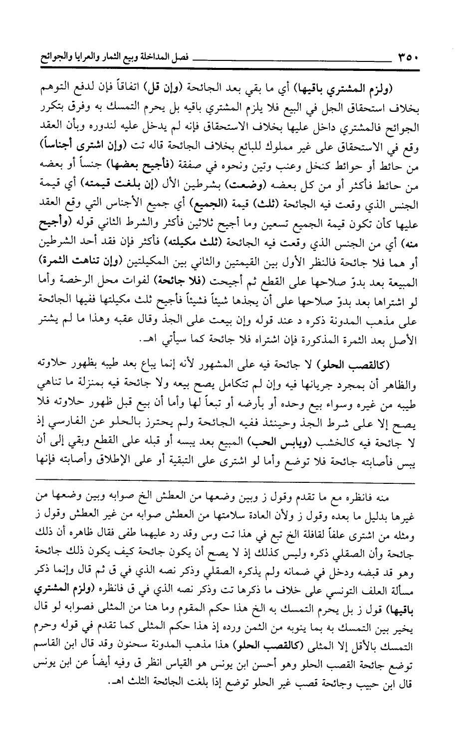 (ولزم المشتري باقيها) أي ما بقي بعد الجائحة (وإن قل) اتفاقًا فإن لدفع التوهم بخلاف استحقاق الجل في البيع فلا يلزم المشتري باقيه بل يحرم التمسك به وفرق بتكرر الجوائح فالمشتري داخل عليها بخلاف الاستحقاق فإنه لم يدخل عليه لندوره وبأن العقد وقع في الاستحقاق على غير مملوك للبائع بخلاف الجائحة قاله تت (وإن اشترى أجناسًا) من حائط أو حوائط كنخل وعنب وتين ونحوه في صفقة (فأجيح بعضها) جنسًا أو بعضه من حائط فأكثر أو من كل بعضه (وضعت) بشرطين الأل (إن بلغت قيمته) أي قيمة الجنس الذي وقعت فيه الجائحة (ثلث) قيمة (الجميع) أي جميع الأجناس التي وقع العقد عليها كأن تكون قيمة الجميع تسعين وما أجيح ثلاثين فأكثر والشرط الثاني قوله (وأجيح منه) أي من الجنس الذي وقعت فيه الجائحة (ثلث مكيلته) فأكثر فإن فقد أحد الشرطين أو هما فلا جائحة فالنظر الأول بين القيمتين والثاني بين المكيلتين (وإن تناهت الثمرة) المبيعة بعد بدوّ صلاحها على القطع ثم أجيحت (فلا جائحة) لفوات محل الرخصة وأما لو اشتراها بعد بدوّ صلاحها على أن يجدها شيئًا فشيئًا فأجيح ثلث مكيلتها ففيها الجائحة على مذهب المدونة ذكره د عند قوله وإن بيعت على الجد وقال عقبه وهذا ما لم يشتر الأصل بعد الثمرة المذكورة فإن اشتراه فلا جائحة كما سيأتي اهـ.