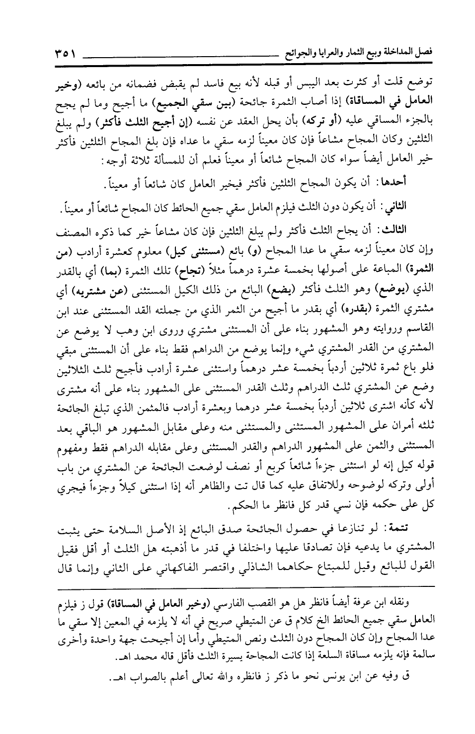 الثاني: أن يكون دون الثلث فيلزم العاهل سقي جميع الحائط كان المجاح شائعًا أو معينًا.