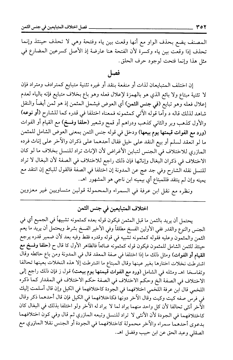 إن اختلف المتبايعان لذات أو منفعة بنقد أو غيره تثنية متبايع كمترادف ومتراد فإن لا تثنية مبتاع ولا بائع الذي هو بالهمزة لإعلال فعله وهو باع بخلاف متبايع فإنه بالياء لعدم إعلال فعله وهو تبايع (جنس الثمن) أي العوض فيشمل المثمن إذ هو ثمن أيضًا والنقل شاهد لذلك قاله د وأما قوله الآتي كمثمونه فمعناه اختلفا في قدره كما للشارح (أو نوعه) والأول كذهب وبر والثاني كذهب ودراهم أو قمح وشعير (حلفا وفسخ) مع القيام أو الفوات (ورد مع الفوات قيمتها يوم بيعها) ودخل في قوله جنس الثمن بمعنى العوض الشامل للمثمن ما لو انعقد لسلم أو بيع النقد على خيل فقال أحدهما على ذكران والآخر على إناث فرده المازري للاختلاف في الجنس لتباين الأغراض لأن الإناث تراد للنسل بخلاف ما لو كان الاختلاف في ذكران البغال وإناثها فإن ذلك راجع للاختلاف في الصفة لأن البغال لا تراد للنسل نقله الشارح وفي جد عج عن المدونة إن اختلفا في الصفة فالقول للبائع إن انتقد مع يمينه وإن لم ينتقد فللمبتاع أي بيمينه ابن ناجي هو المشهور اهـ.
