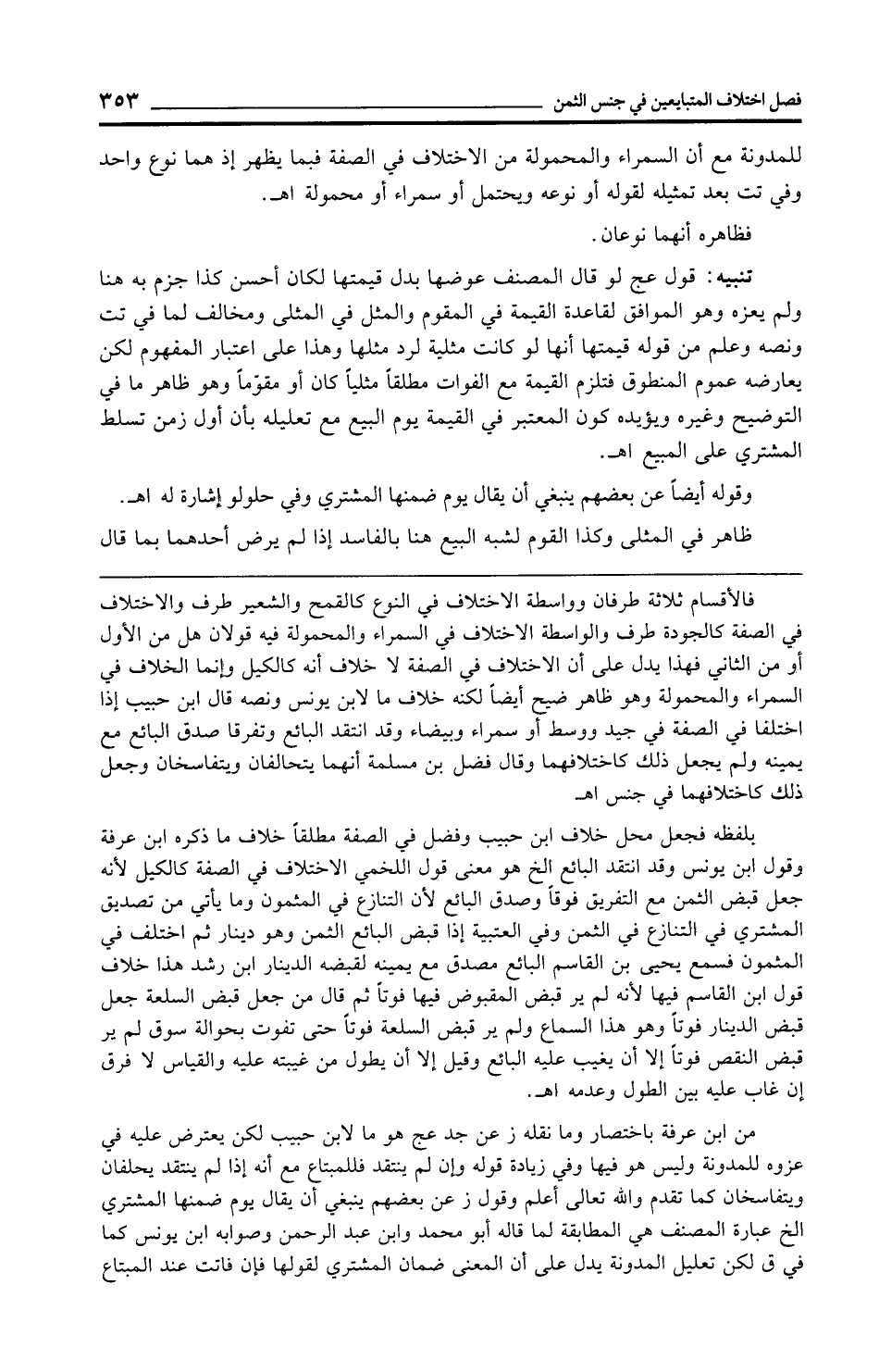 فالأقسام ثلاثة طرفان وواسطة الاختلاف في النوع كالقمح والشعير طرف والاختلاف في الصفة كالجودة طرف والواسطة الاختلاف في السمراء والمحمولة فيه قولان هل من الأول أو من الثاني فهذا يدل على أن الاختلاف في الصفة لا خلاف أنه كالكيل وإنما الخلاف في السمراء والمحمولة وهو ظاهر ضيح أيضًا لكنه خلاف ما لابن يونس ونصه قال ابن حبيب إذا اختلفا في الصفة في جيد ووسط أو سمراء وبيضاء وقد انتقد البائع وتفرقا صدق البائع مع يمينه ولم يجعل ذلك كاختلافهما وقال فضل بن مسلمة أنهما يتحالفان ويتفاسخان وجعل ذلك كاختلافهما في جنس اهـ.