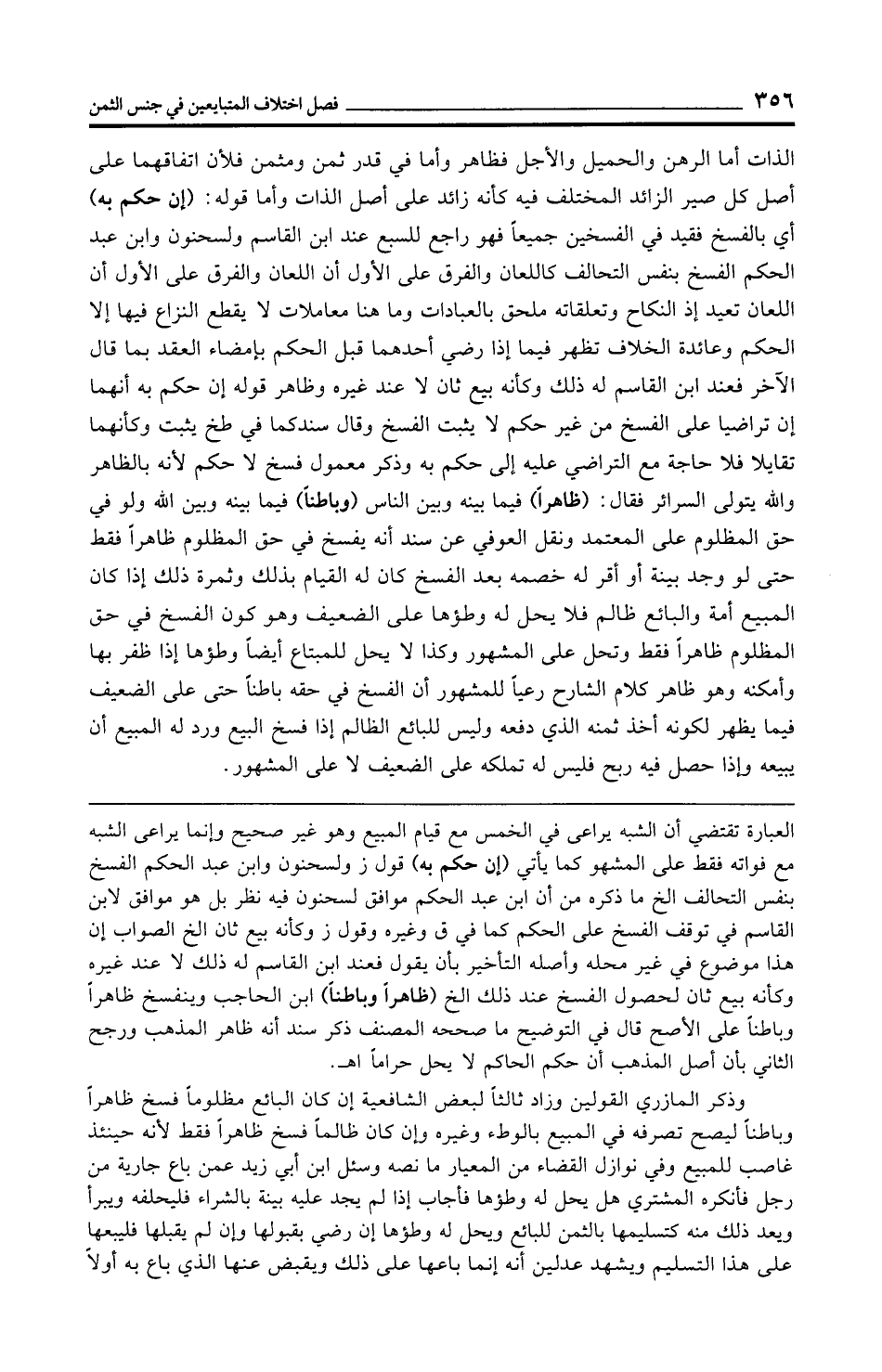 الذات أما الرهن والحميل والأجل فظاهر وأما في قدر ثمن ومثمن فلأن اتفاقهما على أصل كل صير الزائد المختلف فيه كأنه زائد على أصل الذات وأما قوله: (إن حكم به) أي بالفسخ فقيد في الفسخين جميعًا فهو راجع للسبع عند ابن القاسم ولسحنون وابن عبد الحكم الفسخ بنفس التحالف كاللعان والفرق على الأول أن اللعان والفرق على الأول أن اللعان تعيد إذ النكاح وتعلقاته ملحق بالعبادات وما هنا معاملات لا يقطع النزاع فيها إلا الحكم وعائدة الخلاف تظهر فيما إذا رضي أحدهما قبل الحكم بإمضاء العقد بما قال الآخر فعند ابن القاسم له ذلك وكأنه بيع ثان لا عند غيره وظاهر قوله إن حكم به أنهما إن تراضيا على الفسخ من غير حكم لا يثبت الفسخ وقال سندكما في طخ يثبت وكأنهما تقايلا فلا حاجة مع التراضي عليه إلى حكم به وذكر معمول فسخ لا حكم لأنه بالظاهر والله يتولى السرائر فقال: (ظاهرًا) فيما بينه وبين الناس (وباطنًا) فيما بينه وبين الله ولو في حق المظلوم على المعتمد ونقل العوفي عن سند أنه يفسخ في حق المظلوم ظاهرًا فقط حتى لو وجد بينة أو أقر له خصمه بعد الفسخ كان له القيام بذلك وثمرة ذلك إذا كان المبيع أمة والبائع ظالم فلا يحل له وطؤها على الضعيف وهو كون الفسخ في حق المظلوم ظاهرًا فقط وتحل على المشهور وكذا لا يحل للمبتاع أيضًا وطؤها إذا ظفر بها وأمكنه وهو ظاهر كلام الشارح رعيًا للمشهور أن الفسخ في حقه باطنًا حتى على الضعيف فيما يظهر لكونه أخذ ثمنه الذي دفعه وليس للبائع الظالم إذا فسخ البيع ورد له المبيع أن يبيعه وإذا حصل فيه ربح فليس له تملكه على الضعيف لا على المشهور.