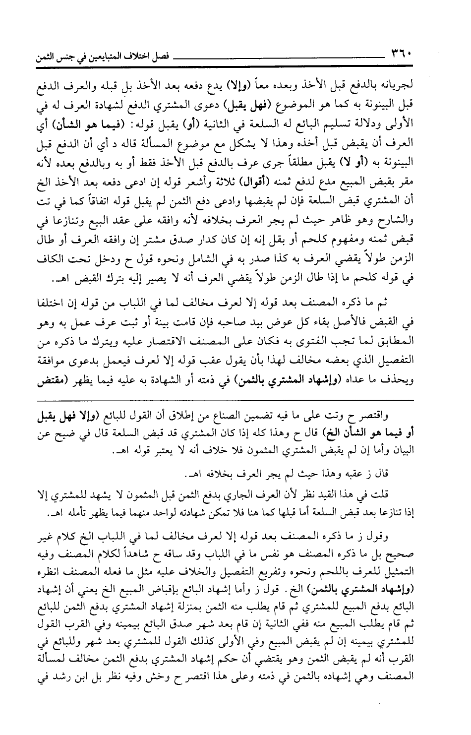 قلت في هذا القيد نظر لأن العرف الجاري بدفع الثمن قبل المثمون لا يشهد للمشتري إلا إذا تنازعا بعد قبض السلعة أما قبلها كما هنا فلا تمكن شهادته لواحد منهما فيما يظهر تأمله اهـ.