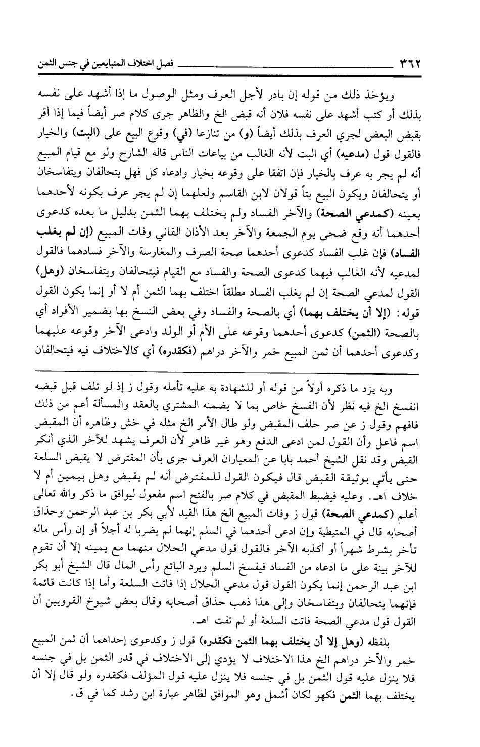 ويؤخذ ذلك من قوله إن بادر لأجل العرف ومثل الوصول ما إذا أشهد على نفسه بذلك أو كتب أشهد على نفسه فلان أنه قبض الخ والظاهر جرى كلام صر أيضًا فيما إذا أقر بقبض البعض لجري العرف بذلك أيضًا (و) من تنازعا (في) وقوع البيع على (البت) والخيار فالقول قول (مدعيه) أي البت لأنه الغالب من بياعات الناس قاله الشارح ولو مع قيام المبيع أنه لم يجر به عرف بالخيار فإن اتفقا على وقوعه بخيار وادعاه كل فهل يتحالفان ويتفاسخان أو يتحالفان ويكون البيع بتًّا قولان لابن القاسم ولعلهما إن لم يجر عرف بكونه لأحدهما بعينه (كمدعي الصحة) والآخر الفساد ولم يختلف بهما الثمن بدليل ما بعده كدعوى أحدهما أنه وقع ضحى يوم الجمعة والآخر بعد الأذان القاني وفات المبيع (إن لم يغلب الفساد) فإن غلب الفساد كدعوى أحدهما صحة الصرف والمغارسة والآخر فسادهما فالقول لمدعيه لأنه الغالب فيهما كدعوى الصحة والفساد مع القيام فيتحالفان ويتفاسخان (وهل) القول لمدعي الصحة إن لم يغلب الفساد مطلقًا اختلف بهما الثمن أم لا أو إنما يكون القول قوله: (إلا أن يختلف بهما) أي بالصحة والفساد وفي بعض النسخ بها بضمير الأفراد أي بالصحة (الثمن) كدعوى أحدهما وقوعه على الأم أو الولد وادعى الآخر وقوعه عليهما وكدعوى أحدهما أن ثمن المبيع خمر والآخر دراهم (فكقدره) أي كالاختلاف فيه فيتحالفان