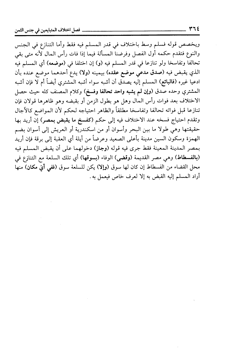 ويخصص قوله فسلم وسط باختلاف في قدر المسلم فيه فقط وأما التنازع في الجنس والنوع فتقدم حكمه أول الفصل وفرضنا المسألة فيما إذا فات رأس المال لأنه متى بقي تحالفا وتفاسخا ولو تنازعا في قدر المسلم فيه (و) إن اختلفا في (موضعه) أي المسلم فيه الذي يقبض فيه (صدق مدعي موضع عقده) بيمينه (ولا) يدع أحدهما موضع عنده بأن ادعيا غيره (فالبائع) المسلم إليه يصدق أن أشبه سواء أشبه المشتري أيضًا أم لا فإن أشبه المشتري وحده صدق (وإن لم يشبه واحد تحالفا وفسخ) وكلام المصنف كله حيث حصل الاختلاف بعد فوات رأس المال وهل هو بطول الزمن أو بقبضه وهو ظاهرها قولان فإن تنازعا قبل فواته تحالفا وتفاسخا مطلقًا والظاهر احتياجه لحكم لأن المواضع كالآجال وتقدم احتياج فسخه عند الاختلاف فيه إلى حكم (كفسخ ما يقبض بمصر) إن أريد بها حقيقتها وهي طولا ما بين البحر وأسوان أو من إسكندرية أو العريش إلى أسوان بضم الهمزة وسكون السين مدينة بأعلى الصعيد وعرضًا من أيلة أي العقبة إلى برقة فإن أريد بمصر المدينة المعينة فقط جرى فيه قوله (وجاز) دخولهما على أن يقبض المسلم فيه (بالفسطاط) وهي مصر القديمة (وقضى) الوفاء (بسوقها) أي تلك السلعة مع التنازع في محل القضاء من الفسطاط إن كان لها سوق (وإلا) يكن للسلعة سوق (ففي أي مكان) منها أراد المسلم إليه القبض به إلا لعرف خاص فيعمل به.