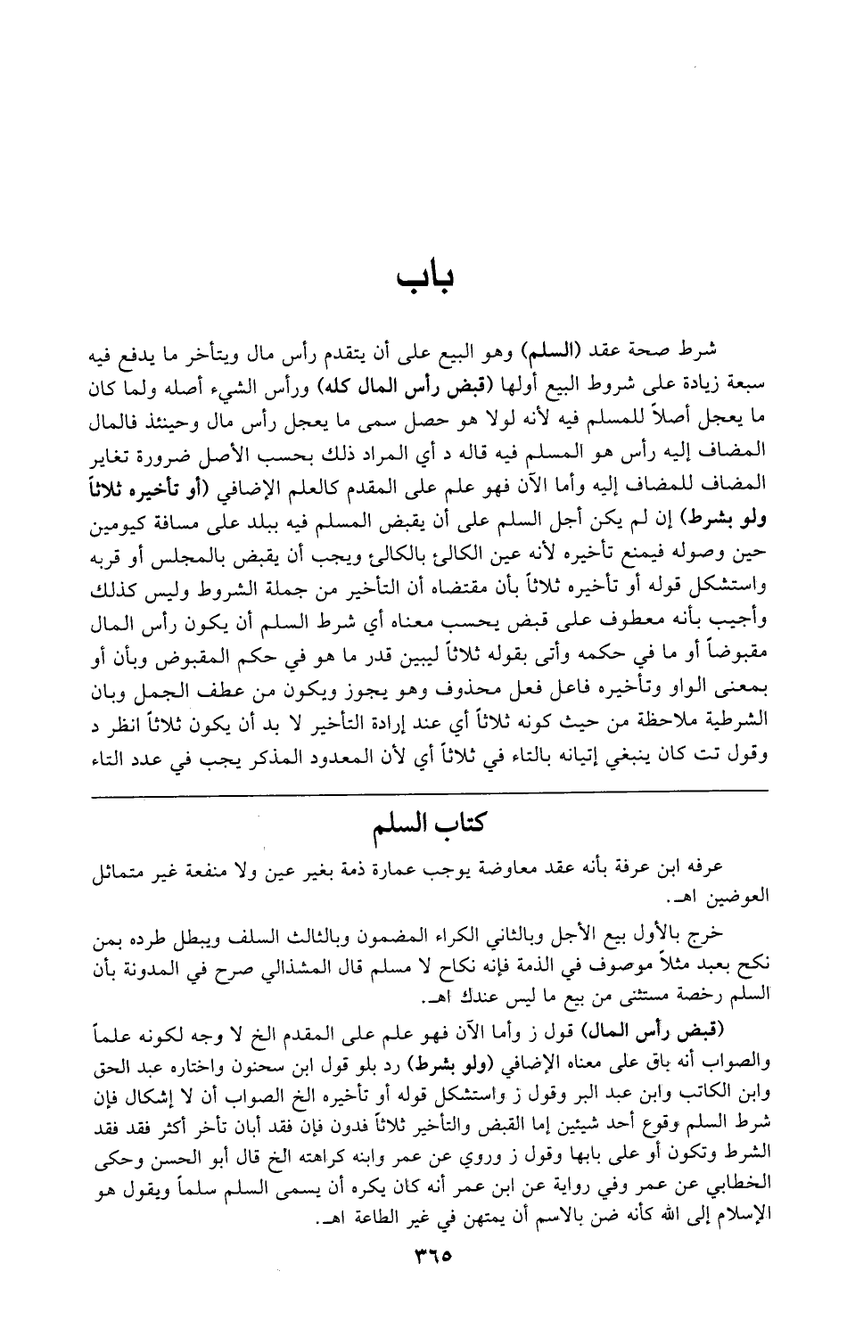 شرط صحة عقد (السلم) وهو البيع على أن يتقدم رأس مال ويتأخر ما يدفع فيه سبعة زيادة على شروط البيع أولها (قبض رأس المال كله) ورأس الشيء أصله ولما كان ما يعجل أصلًا للمسلم فيه لأنه لولا هو حصل سمى ما يعجل رأس مال وحينئذ فالمال المضاف إليه رأس هو المسلم فيه قاله د أي المراد ذلك بحسب الأصل ضرورة تغاير المضاف للمضاف إليه وأما الآن فهو علم على المقدم كالعلم الإضافي (أو تأخيره ثلاثًا ولو بشرط) إن لم يكن أجل السلم على أن يقبض المسلم فيه ببلد على مسافة كيومين حين وصوله فيمنع تأخيره لأنه عين الكالئ بالكالئ ويجب أن يقبض بالمجلس أو قربه واستشكل قوله أو تأخيره ثلاثًا بأن مقتضاه أن التأخير من جملة الشروط وليس كذلك وأجيب بأنه معطوف على قبض يحسب معناه أي شرط السلم أن يكون رأس المال مقبوضًا أو ما في حكمه وأتى بقوله ثلاثًا ليبين قدر ما هو في حكم المقبوض وبأن أو بمعنى الواو وتأخيره فاعل فعل محذوف وهو يجوز ويكون من عطف الجمل وبأن الشرطية ملاحظة من حيث كونه ثلاثًا أي عند إرادة التأخير لا بد أن يكون ثلاثًا انظر د وقول تت كان ينبغي إتيانه بالتاء في ثلاثًا أي لأن المعدود المذكر يجب في عدد التاء