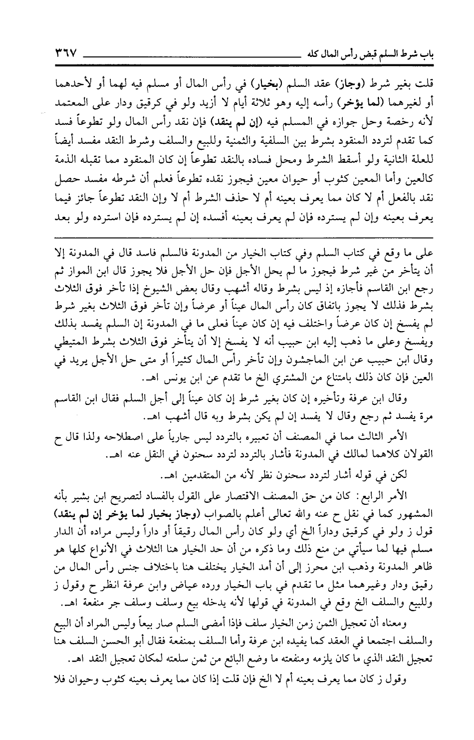 قلت بغير شرط (وجاز) عقد السلم (بخيار) في رأس المال أو مسلم فيه لهما أو لأحدهما أو لغيرهما (لما يؤخر) رأسه إليه وهو ثلاثة أيام لا أزيد ولو في كرقيق ودار على المعتمد لأنه رخصة وحل جوازه في المسلم فيه (إن لم ينقد) فإن نقد رأس المال ولو تطوعًا فسد كما تقدم لتردد المنقود بشرط بين السلفية والثمنية وللبيع والسلف وشرط النقد مفسد أيضًا للعلة الثانية ولو أسقط الشرط ومحل فساده بالنقد تطوعًا إن كان المنقود مما تقبله الذمة كالعين وأما المعين كثوب أو حيوان معين فيجوز نقده تطوعًا فعلم أن شرطه مفسد حصل نقد بالفعل أم لا كان مما يعرف بعينه أم لا حذف الشرط أم لا وإن النقد تطوعًا جائز فيما يعرف بعينه وإن لم يسترده فإن لم يعرف بعينه أفسده إن لم يسترده فإن استرده ولو بعد