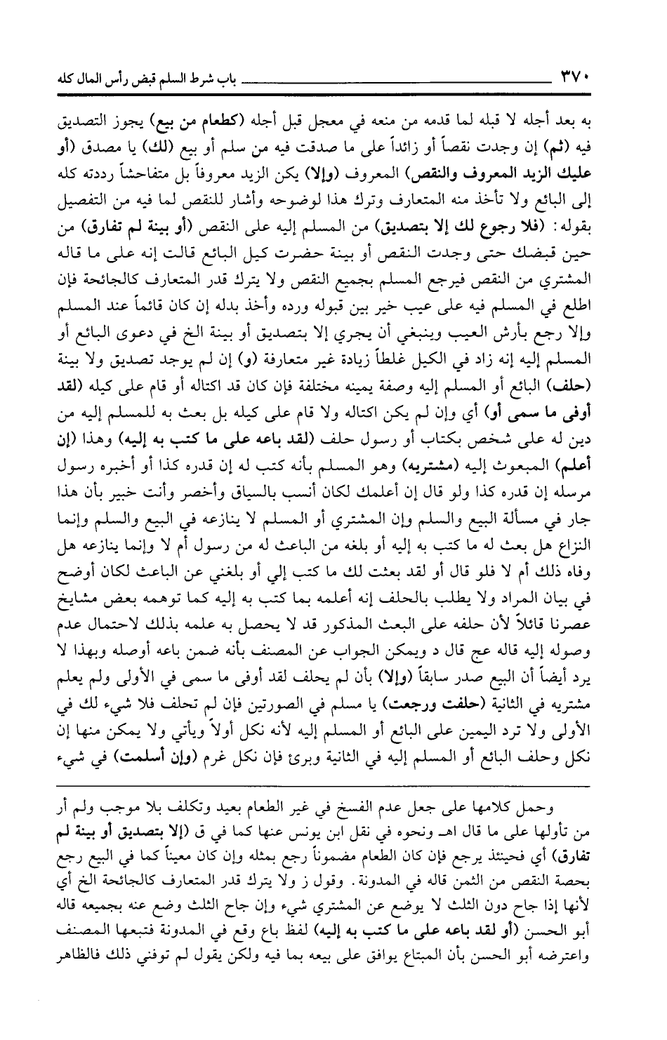 به بعد أجله لا قبله لما قدمه من منعه في معجل قبل أجله (كطعام من بيع) يجوز التصديق فيه (ثم) إن وجدت نقصًا أو زائدًا على ما صدقت فيه من سلم أو بيع (لك) يا مصدق (أو عليك المزيد المعروف والنقص) المعروف (وإلا) يكن المزيد معروفًا بل متفاحشًا رددته كله إلى البائع ولا تأخذ منه المتعارف وترك هذا لوضوحه وأشار للنقص لما فيه من التفصيل بقوله: (فلا رجوع لك إلا بتصديق) من المسلم إليه على النقص (أو بينة لم تفارق) من حين قبضك حتى وجدت النقص أو بينة حضرت كيل البائع قالت إنه على ما قاله المشتري من النقص فيرجع المسلم بجميع النقص ولا يترك قدر المتعارف كالجائحة فإن اطلع في المسلم فيه على عيب خير بين قبوله ورده وأخذ بدله إن كان قائمًا عند المسلم وإلا رجع بأرش العيب وينبغي أن يجري إلا بتصديق أو بينة الخ في دعوى البائع أو المسلم إليه إنه زاد في الكيل غلطًا زيادة غير متعارفة (و) إن لم يوجد تصديق ولا بينة (حلف) البائع أو المسلم إليه وصفة يمينه مختلفة فإن كان قد اكتاله أو قام على كيله (لقد أوفى ما سمى أو) أي وإن لم يكن اكتاله ولا قام على كيله بل بعث به للمسلم إليه من دين له على شخص بكتاب أو رسول حلف (لقد باعه على ما كتب به إليه) وهذا (إن أعلم) المبعوث إليه (مشتريه) وهو المسلم بأنه كتب له إن قدره كذا أو أخبره رسول مرسله إن قدره كذا ولو قال إن أعلمك لكان أنسب بالسياق وأخصر وأنت خبير بأن هذا جار في مسألة البيع والسلم وإن المشتري أو المسلم لا ينازعه في البيع والسلم وإنما النزاع هل بعث له ما كتب به إليه أو بلغه من الباعث له من رسول أم لا وإنما ينازعه هل وفاه ذلك أم لا فلو قال أو لقد بعثت لك ما كتب إلى أو بلغني عن الباعث لكان أوضح في بيان المراد ولا يطلب بالحلف إنه أعلمه بما كتب به إليه كما توهمه بعض مشايخ عصرنا قائلًا لأن حلفه على البعث المذكور قد لا يحصل به علمه بذلك لاحتمال عدم وصوله إليه قاله عج قال د ويمكن الجواب عن المصنف بأنه ضمن باعه أوصله وبهذا لا يرد أيضًا أن البيع صدر سابقًا (وإلا) بأن لم يحلف لقد أوفى ما سمى في الأولى ولم يعلم مشتريه في الثانية (حلفت ورجعت) يا مسلم في الصورتين فإن لم تحلف فلا شيء لك في الأولى ولا ترد اليمين على البائع أو المسلم إليه لأنه نكل أولًا ويأتي ولا يمكن منها إن نكل وحلف البائع أو المسلم إليه في الثانية وبرئ فإن نكل غرم (وإن أسلمت) في شيء