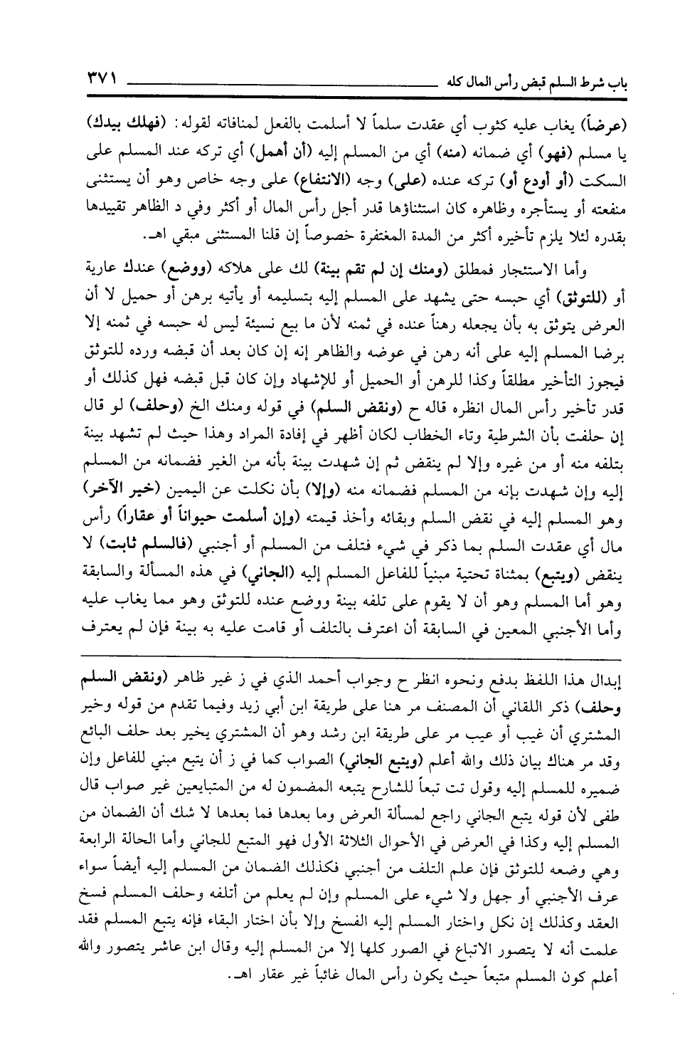 وأما الاستئجار فمطلق (ومنك إن لم تقم بينة) لك على هلاكه (ووضع) عندك عارية أو (للتوثق) أي حبسه حتى يشهد على المسلم إليه بتسليمه أو يأتيه برهن أو حميل لا أن العرض يتوثق به بأن يجعله رهنًا عنده في ثمنه لأن ما بيع نسيئة ليس له حبسه في ثمنه إلا برضا المسلم إليه على أنه رهن في عوضه والظاهر إنه إن كان بعد أن قبضه ورده للتوثق فيجوز التأخير مطلقًا وكذا للرهن أو الحميل أو للإشهاد وإن كان قبل قبضه فهل كذلك أو قدر تأخير رأس المال انظره قاله ح (ونقض السلم) في قوله ومنك الخ (وحلف) لو قال إن حلفت بأن الشرطية وتاء الخطاب لكان أظهر في إفادة المراد وهذا حيث لم تشهد بينة بتلفه منه أو من غيره وإلا لم ينقض ثم إن شهدت بينة بأنه من الغير فضمانه من المسلم إليه وإن شهدت بإنه من المسلم فضمانه منه (وإلا) بأن نكلت عن اليمين (خير الآخر) وهو المسلم إليه في نقض السلم وبقائه وأخذ قيمته (وإن أسلمت حيوانًا أو عقارًا) رأس مال أي عقدت السلم بما ذكر في شيء فتلف من المسلم أو أجنبي (فالسلم ثابت) لا ينقض (ويتبع) بمثناة تحتية مبنيًّا للفاعل المسلم إليه (الجاني) في هذه المسألة والسابقة وهو أما المسلم وهو أن لا يقوم على تلفه بينة ووضع عنده للتوثق وهو مما يغاب عليه وأما الأجنبي المعين في السابقة أن اعترف بالتلف أو قامت عليه به بينة فإن لم يعترف