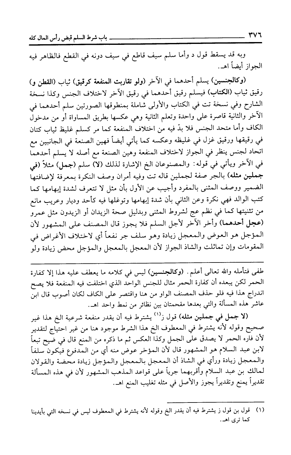 (وكالجنسين) يسلم أحدهما في الآخر (ولو تقاربت المنفعة كرقيق) ثياب (القطن و) رقيق ثياب (الكتاب) فيسلم رقيق أحدهما في رقيق الآخر لاختلاف الجنس وكذا نسخة الشارح وفي نسخة تت في الكتاب والأولى شاملة بمنطوقها الصورتين سلم أحدهما في الآخر والثانية قاصرة على واحدة وتعلم الثانية وهي عكسها بطريق المساواة أو من مدخول الكاف وأما متحد الجنس فلا بد فيه من اختلاف المنفعة كما مر كسلم غليظ ثياب كتان في رقيقها ورقيق غزل في غليظه وعكسه كما يأتي أيضًا فهين الصنعة في الجانبين مع اتحاد لجنس ينظر في الجواز لاختلاف المنفعة وهين الصنعة مع أصله لا يسلم أحدهما في الآخر ويأتي في قوله: والمصنوعان الخ الإشارة لذلك (لا) سلم (جمل) مثلًا (في جملين مثله) بالجر صفة لجملين قاله تت وفيه أمران وصف النكرة بمعرفة لإضافتها الضمير ووصف المثنى بالمفرد وأجيب عن الأول بأن مثل لا تتعرف لشدة إبهامها كما كتب الوالد فهي نكرة وعن الثاني بأن شدة إبهامها وتوغلها فيه كأحد وديار وعريب مانع من تثنيتها كما في نظم عج لشروط المثنى وبدليل صحة الزيدان أو الزيدون مثل عمرو (عجل أحدهما) وأخر الآخر لأجل السلم فلا يجوز قال المصنف على المشهور لأن المؤجل هو العوض والمعجل زيادة وهو سلف جر نفعًا أي لاختلاف الأغراض في المقومات وإن تماثلت والشاذ الجواز لأن المعجل بالمعجل والمؤجل محض زيادة ولو