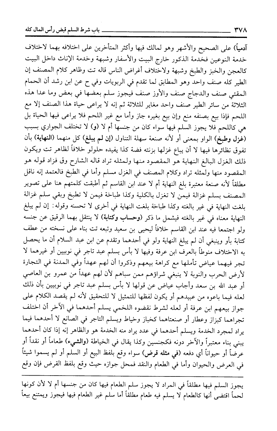 آدميًّا) على الصحيح والأشهر وهو لمالك فيها وأكثر المتأخرين على اختلافه بهما لاختلاف خدمة النوعين فخدمة الذكور خارج البيت والأسفار وشبهة وخدمة الإناث داخل البيت كالعجن والخبر والطبخ وشبهة ولاختلاف أغراض الناس قاله تت وظاهر كلام المصنف إن الطير كله صنف واحد وهو المطابق لما تقدم في الربويات وفي ح عن ابن رشد أن الحمام المقتي صنف والدجاج صنف والأوز صنف فيجوز سلم بعضها في بعض وما عدا هذه الثلاثة من سائر الطير صنف واحد مغاير للثلاثة ثم إنه لا يراعى حياة هذا الصنف إلا مع اللحم فإذا بيع بصنفه منع وإن بيع بغيره جاز وأما مع غير اللحم فلا يراعى فيها الحياة بل هي كاللحم فلا يجوز السلم فيها سواء كان من جنسها أم لا (و) لا تختلف الجواري بسبب (غزل وطبخ) الواو بمعنى أو لأنه صنعة سهلة التناول (إن لم يبلغ) كل منهما (النهاية) بأن تفوق نظائرها فيها لا أن يباع غزلها بزنته فضة كذا يفيده حلولو خلافًا لظاهر تت ويكون ذلك الغزل البالغ النهاية هو المقصود منها ولمثله تراد قاله الشارح وق فزاد قوله هو المقصود منها ولمثله تراد وكلام المصنف في الغزل مسلم وأما في الطبخ فالمعتمد إنه ناقل مطلقًا لأنه صنعة معتبرة بلغ النهاية أم لا عند ابن القاسم ثم أطبقت كلمتهم هنا على تصوير المصنف بسلم غزالة فيمن لا تغزل بالكلية وكذا طباخة فيمن لا تطبخ وبقي سلم غزالة بلغت النهاية في غير بالغته وكذا طباخة بلغت النهاية في أخرى لا تحسنه وقوله: إن لم يبلغ النهاية معناه في غير بالغته فيشمل ما ذكر (وحساب وكتابة) لا ينتقل بهما الرقيق عن جنسه ولو اجتمعا فيه عند ابن القاسم خلافًا ليحيى بن سعيد وتبعه تت بناء على نسخته من عطف كتابة بأو وينبغي أن لم يبلغ النهاية ولو في أحدهما وتقدم عن ابن عبد السلام أن ما يحصل به الاختلاف منوطًا بالعرف ابن عرفة وفيها لا بأس بسلم عبد تاجر في نوبيين أو غيرهما لا تجر فيهما عياض تأملها مع كراهة بيعهم وذكروا أن لهم عهدًا وفي المدنة في التجارة لأرض الحرب والنوبة لا ينبغي شراؤهم ممن سباهم لأن لهم عهدًا من عمرو بن العاصي أو عبد الله بن سعد وأجاب عياض عن قولها لا بأس بسلم عبد تاجر في نوبيين بأن ذلك لعله فيما باعوه من عبيدهم أو يكون لفظها للتمثيل لا للتحقيق لأنه لم يقصد الكلام على جواز بيعهم ابن عرفة أو لعله لشرط نقضوه اللخمي يسلم أحدهما في الآخر أن اختلف تجراهما كبزاز وعطار أو صنعتاهما كخباز وخياط ويسلم التاجر في الصانع لا أحدهما فيما يراد لمجرد الخدمة ويسلم أحدهما في عدد يراد منه الخدمة هو والظاهر إنه إذا كان أحدهما يبني بناء معتبرًا والآخر دونه فكجنسين وكذا يقال في الخياطة (والشيء) طعامًا أو نقدًا أو عرضًا أو حيوانًا أي دفعه (في مثله قرض) سواء وقع بلفظ البيع أو السلم أو لم يسموا شيئًا في العرض والحيوان وأما في الطعام والنقد فمحل جوازه حيث وقع بلفظ القرض فإن وقع