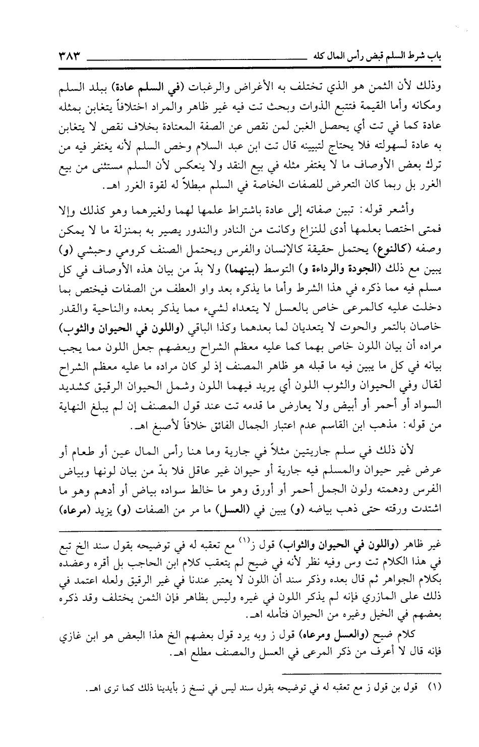 غير ظاهر (واللون في الحيوان والثواب) قول ز (¬1) مع تعقبه له في توضيحه بقول سند الخ تبع في هذا الكلام تت وس وفيه نظر لأنه في ضيح لم يتعقب كلام ابن الحاجب بل أقره وعضده بكلام الجواهر ثم قال بعده وذكر سند أن اللون لا يعتبر عندنا في غير الرقيق ولعله اعتمد في ذلك على المازري فإنه لم يذكر اللون في غيره وليس بظاهر فإن الثمن يختلف وقد ذكره بعضهم في الخيل وغيره من الحيوان فتأمله اهـ.