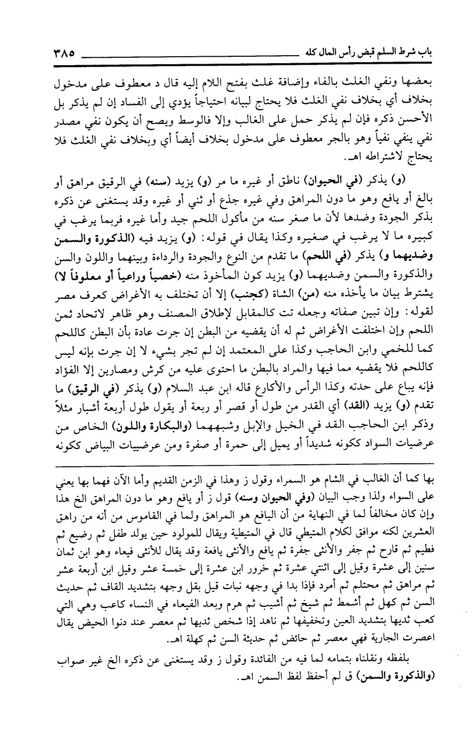 (و) يذكر (في الحيوان) ناطق أو غيره ما مر (و) يزيد (سنه) في الرقيق مراهق أو بالغ أو يافع وهو ما دون المراهق وفي غيره جذع أو ثني أو غيره وقد يستغنى عن ذكره بذكر الجودة وضدها لأن ما صغر سنه من مأكول اللحم جيد وأما غيره فربما يرغب في كبيره ما لا يرغب في صغيره وكذا يقال في قوله: (و) يزيد فيه (الذكورة والسمن وضديهما و) يذكر (في اللحم) ما تقدم من النوع والجودة والرداءة وبينهما واللون والسن والذكورة والسمن وضديهما (و) يزيد كون المأخوذ منه (خصيًّا وراعيًا أو معلوفًا لا) يشترط بيان ما يأخذه منه (من) الشاة (كجنب) إلا أن تختلف به الأغراض كعرف مصر لقوله: وإن تبين صفاته وجعله تت كالمقابل لإطلاق المصنف وهو ظاهر لاتحاد ثمن اللحم وإن اختلفت الأغراض ثم له أن يقضيه من البطن إن جرت عادة بأن البطن كاللحم كما للخمي وابن الحاجب وكذا على المعتمد إن لم تجر بشيء لا إن جرت بإنه ليس كاللحم فلا يقضيه مما فيها والمراد بالبطن ما احتوى عليه من كرش ومصارين إلا الفؤاد فإنه يباع على حدته وكذا الرأس والأكارع قاله ابن عبد السلام (و) يذكر (في الرقيق) ما تقدم (و) يزيد (النقد) أي القدر من طول أو قصر أو ربعة أو يقول طول أربعة أشبار مثلًا وذكر ابن الحاجب القد في الخيل والإبل وشبههما (والبكارة واللون) الخاص من عرضيات السواد ككونه شديدًا أو يميل إلى حمرة أو صفرة ومن عرضييات البياض ككونه