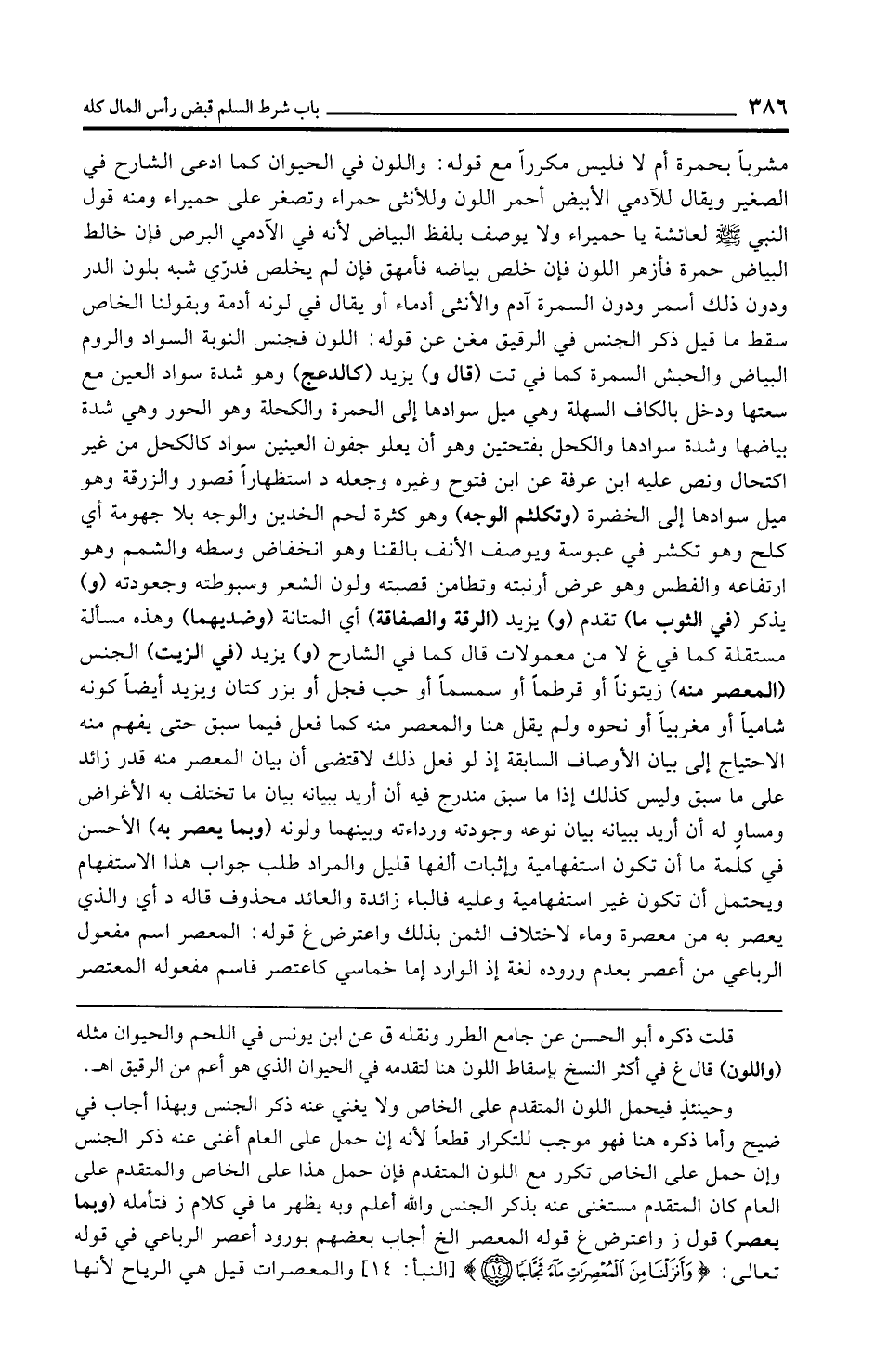 وحينئذٍ فيحمل اللون المتقدم على الخاص ولا يغني عنه ذكر الجنس وبهذا أجاب في ضيح وأما ذكره هنا فهو موجب للتكرار قطعًا لأنه إن حمل على العام أغنى عنه ذكر الجنس وإن حمل على الخاص تكرر مع اللون المتقدم فإن حمل هذا على الخاص والمتقدم على العام كان المتقدم مستغنى عنه بذكر الجنس والله أعلم وبه يظهر ما في كلام ز فتأمله (وبما يعصر) قول ز واعترض غ قوله المعصر الخ أجاب بعضهم بورود أعصر الرباعي في قوله تعالى: {وَأَنْزَلْنَا مِنَ الْمُعْصِرَاتِ مَاءً ثَجَّاجًا} [النبأ: 14] والمعصرات قيل هي الرياح لأنها