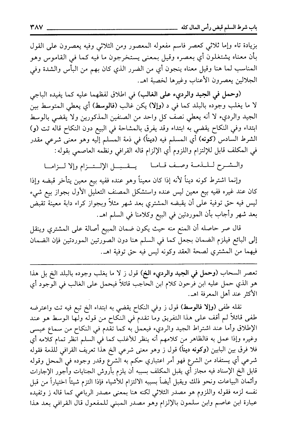 (وحمل في الجيد والرديء على الغالب) في إطلاق لفظهما عليه كما يفيده الباجي لا ما يغلب وجوده بالبلد كما في د (وإلا) يكن غالب (فالوسط) أي يعطي المتوسط بين الجيد والرديء لا أنه يعطي نصف كل واحد من الصنفين المذكورين ولا يقضي بالوسط ابتداء وفي النكاح يقضي به ابتداء وقد يفرق بالمشاحة في البيع دون النكاح قاله تت (و) الشرط السادس (كونه) أي المسلم فيه (دينًا) في ذمة المسلم إليه وهو معنى شرعي مقدر في المكلف قابل للإلتزام واللزوم أي الإلزام قاله القرافي ونظمه العاصمي بقوله: