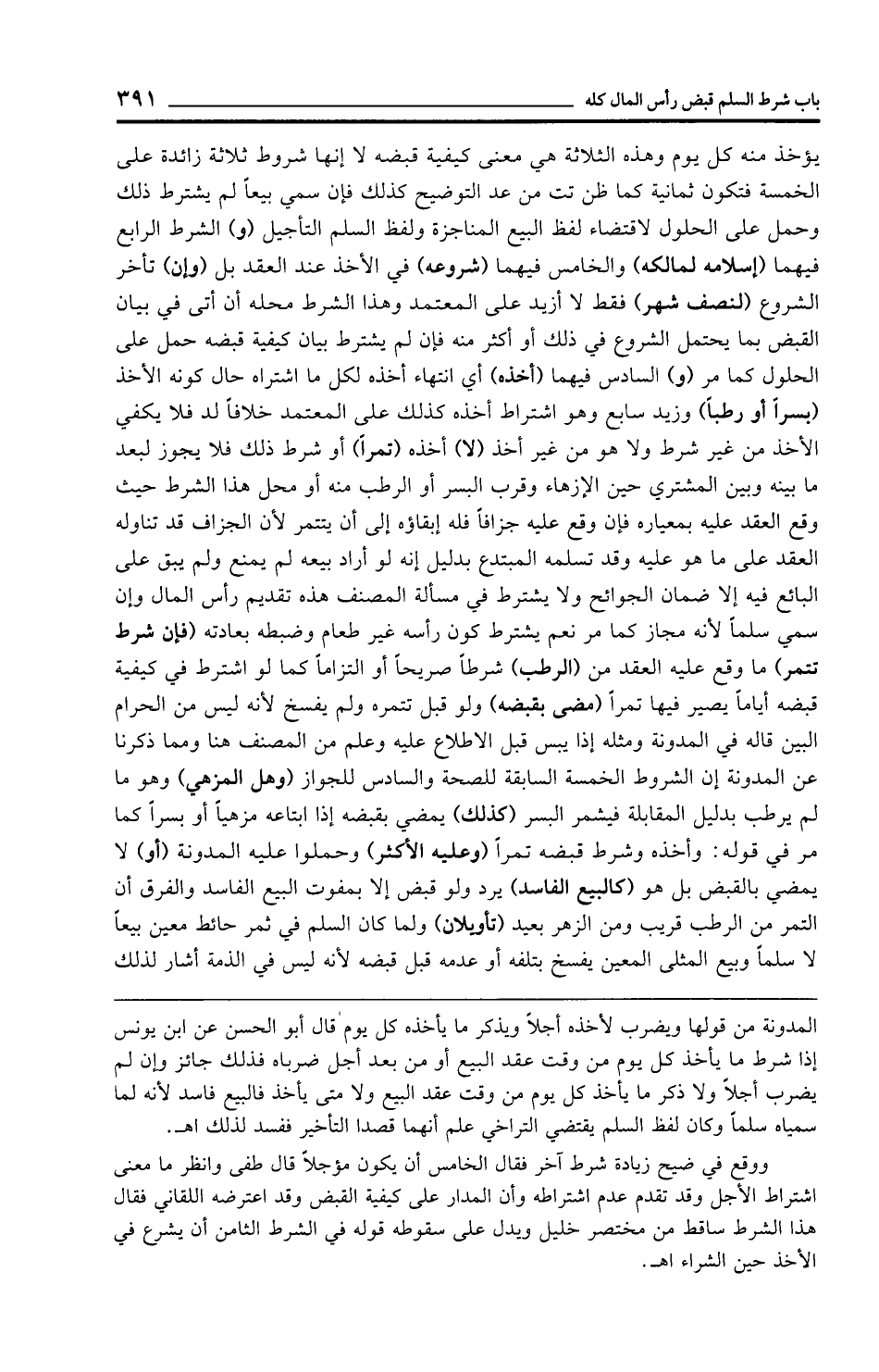 ووقع في ضيح زيادة شرط آخر فقال الخامس أن يكون مؤجلًا قال طفى وانظر ما معنى اشتراط الأجل وقد تقدم عدم اشتراطه وأن المدار على كيفية القبض وقد اعترضه اللقاني فقال هذا الشرط ساقط من مختصر خليل ويدل على سقوطه قوله في الشرط الثامن أن يشرع في الأخذ حين الشراء اهـ.