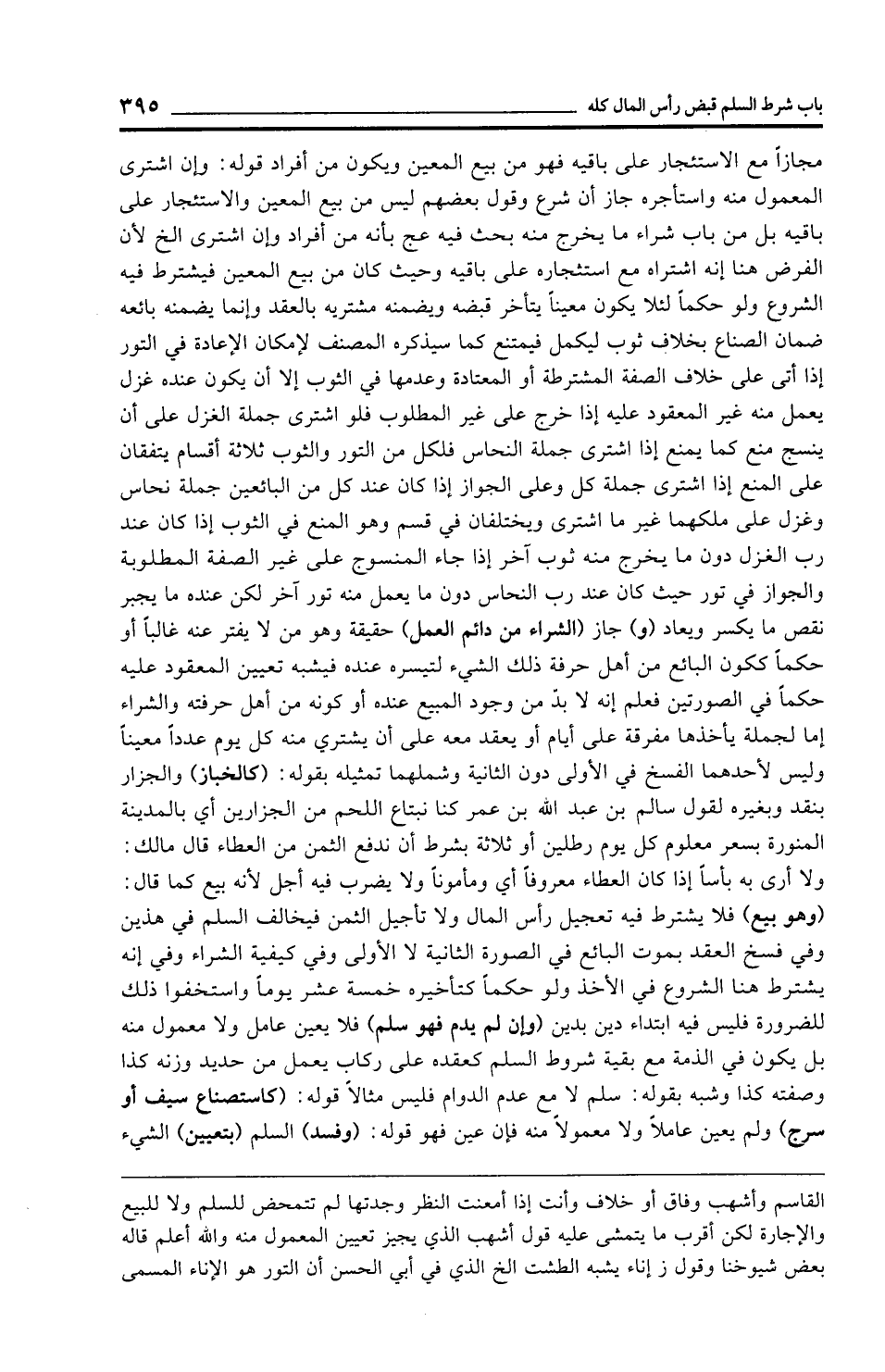 مجازًا مع الاستئجار على باقيه فهو من بيع المعين ويكون من أفراد قوله: وإن اشترى المعمول منه واستأجره جاز أن شرع وقول بعضهم ليس من بيع المعين والاستئجار على باقيه بل من باب شراء ما يخرج منه بحث فيه عج بأنه من أفراد وإن اشترى الخ لأن الفرض هنا إنه اشتراه مع استئجاره على باقيه وحيث كان من بيع المعين فيشترط فيه الشروع ولو حكمًا لئلا يكون معينًا يتأخر قبضه ويضمنه مشتريه بالعقد وإنما يضمنه بائعه ضمان الصناع بخلاف ثوب ليكمل فيمتنع كما سيذكره المصنف لإمكان الإعادة في التور إذا أتى على خلاف الصفة المشترطة أو المعتادة وعدمها في الثوب إلا أن يكون عنده غزل يعمل منه غير المعقود عليه إذا خرج على غير المطلوب فلو اشترى جملة الغزل على أن ينسج منع كما يمنع إذا اشترى جملة النحاس فلكل من التور والثوب ثلاثة أقسام يتفقان على المنع إذا اشترى جملة كل وعلى الجواز إذا كان عند كل من البائعين جملة نحاس وغزل على ملكهما غير ما اشترى ويختلفان في قسم وهو المنع في الثوب إذا كان عند رب الغزل دون ما يخرج منه ثوب آخر إذا جاء المنسوج على غير الصفة المطلوبة والجواز في تور حيث كان عند رب النحاس دون ما يعمل منه تور آخر لكن عنده ما يجبر نقص ما يكسر ويعاد (و) جاز (الشراء من دائم العمل) حقيقة وهو من لا يفتر عنه غالبًا أو حكمًا ككون البائع من أهل حرفة ذلك الشيء لتيسره عنده فيشبه تعيين المعقود عليه حكمًا في الصورتين فعلم إنه لا بدّ من وجود المبيع عنده أو كونه من أهل حرفته والشراء إما لجملة يأخذها مفرقة على أيام أو يعقد معه على أن يشتري منه كل يوم عددًا معينًا وليس لأحدهما الفسخ في الأولى دون الثانية وشملهما تمثيله بقوله: (كالخباز) والجزار بنقد وبغيره لقول سالم بن عبد الله بن عمر كنا نبتاع اللحم من الجزارين أي بالمدينة المنورة بسعر معلوم كل يوم رطلين أو ثلاثة بشرط أن ندفع الثمن من العطاء قال مالك: ولا أرى به بأسًا إذا كان العطاء معروفًا أي ومأمونًا ولا يضرب فيه أجل لأنه بيع كما قال: (وهو بيع) فلا يشترط فيه تعجيل رأس المال ولا تأجيل الثمن فيخالف السلم في هذين وفي فسخ العقد بموت البائع في الصورة الثانية لا الأولى وفي كيفية الشراء وفي إنه يشترط هنا الشروع في الأخذ ولو حكمًا كتأخيره خمسة عشر يومًا واستخفوا ذلك للضرورة فليس فيه ابتداء دين بدين (وإن لم يدم فهو سلم) فلا يعين عامل ولا معمول منه بل يكون في الذمة مع بقية شروط السلم كعقده على ركاب يعمل من حديد وزنه كذا وصفته كذا وشبه بقوله: سلم لا مع عدم الدوام فليس مثالًا قوله: (كاستصناع سيف أو سرج) ولم يعين عاملًا ولا معمولًا منه فإن عين فهو قوله: (وفسد) السلم (بتعيين) الشيء