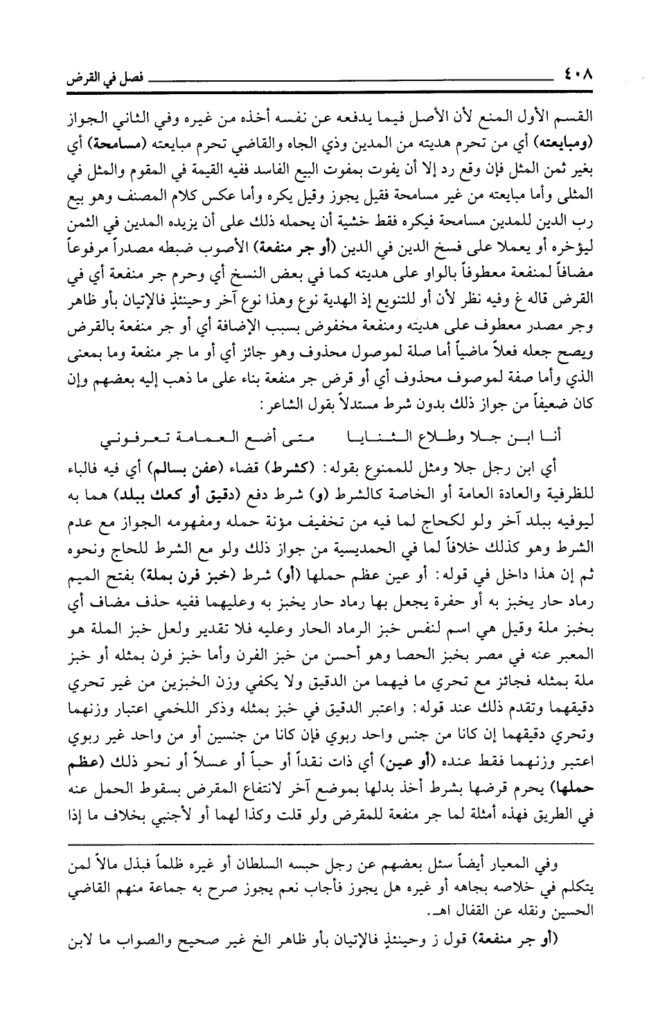 القسم الأول المنع لأن الأصل فيما يدفعه عن نفسه أخذه من غيره وفي الثاني الجواز (ومبايعته) أي من تحرم هديته من المدين وذي الجاه والقاضي تحرم مبايعته (مسامحة) أي بغير ثمن المثل فإن وقع رد إلا أن يفوت بمفوت البيع الفاسد ففيه القيمة في المقوم والمثل في المثلى وأما مبايعته من غير مسامحة فقيل يجوز وقيل يكره وأما عكس كلام المصنف وهو بيع رب الدين للمدين مسامحة فيكره فقط خشية أن يحمله ذلك على أن يزيده المدين في الثمن ليؤخره أو يعملا على فسخ الدين في الدين (أو جر منفعة) الأصوب ضبطه مصدرًا مرفوعًا مضافًا لمنفعة معطوفًا بالواو على هديته كما في بعض النسخ أي وحرم جر منفعة أي في القرض قاله غ وفيه نظر لأن أو للتنويع إذ الهدية نوع وهذا نوع آخر وحينئذٍ فالإتيان بأو ظاهر وجر مصدر معطوف على هديته ومنفعة مخفوض بسبب الإضافة أي أو جر منفعة بالقرض ويصح جعله فعلًا ماضيًا أما صلة لموصول محذوف وهو جائز أي أو ما جر منفعة وما بمعنى الذي وأما صفة لموصوف محذوف أي أو قرض جر منفعة بناء على ما ذهب إليه بعضهم وإن كان ضعيفًا من جواز ذلك بدون شرط مستدلًا بقول الشاعر: