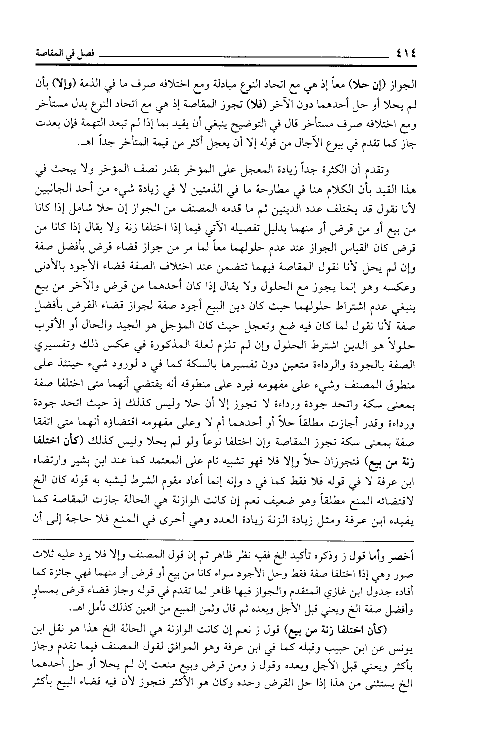 وتقدم أن الكثرة جدًّا زيادة المعجل على المؤخر بقدر نصف المؤخر ولا يبحث في هذا القيد بأن الكلام هنا في مطارحة ما في الذمتين لا في زيادة شيء من أحد الجانبين لأنا نقول قد يختلف عدد الدينين ثم ما قدمه المصنف من الجواز إن حلا شامل إذا كانا من بيع أو من قرض أو منهما بدليل تفصيله الآتي فيما إذا اختلفا زنة ولا يقال إذا كانا من قرض كان القياس الجواز عند عدم حلولهما معًا لما مر من جواز قضاء قرض بأفضل صفة وإن لم يحل لأنا نقول المقاصة فيهما تتضمن عند اختلاف الصفة قضاء الأجود بالأدنى وعكسه وهو إنما يجوز مع الحلول ولا يقال إذا كان أحدهما من قرض والآخر من بيع ينبغي عدم اشتراط حلولهما حيث كان دين البيع أجود صفة لجواز قضاء القرض بأفضل صفة لأنا نقول لما كان فيه ضع وتعجل حيث كان المؤجل هو الجيد والحال أو الأقرب حلولًا هو الدين اشترط الحلول وإن لم تلزم لعلة المذكورة في عكس ذلك وتفسيري الصفة بالجودة والرداءة متعين دون تفسيرها بالسكة كما في د لورود شيء حينئذ على منطوق المصنف وشيء على مفهومه فيرد على منطوقه أنه يقتضي أنهما متى اختلفا صفة بمعنى سكة واتحد جودة ورداءة لا تجوز إلا أن حلا وليس كذلك إذ حيث اتحد جودة ورداءة وقدر أجازت مطلقًا حلًا أو أحدهما أم لا وعلى مفهومه اقتضاؤه أنهما متى اتفقا صفة بمعنى سكة تجوز المقاصة وإن اختلفا نوعًا ولو لم يحلا وليس كذلك (كأن اختلفا زنة من بيع) فتجوزان حلًا وإلا فلا فهو تشبيه تام على المعتمد كما عند ابن بشير وارتضاه ابن عرفة لا في قوله فلا فقط كما في د وإنه إنما أعاد م قوله الشرط ليشبه به قوله كان الخ لاقتضائه المنع مطلقًا وهو ضعيف نعم إن كانت الوازنة هي الحالة جازت المقاصة كما يفيده ابن عرفة ومثل زيادة الزنة زيادة العدد وهي أحرى في المنع فلا حاجة إلى أن