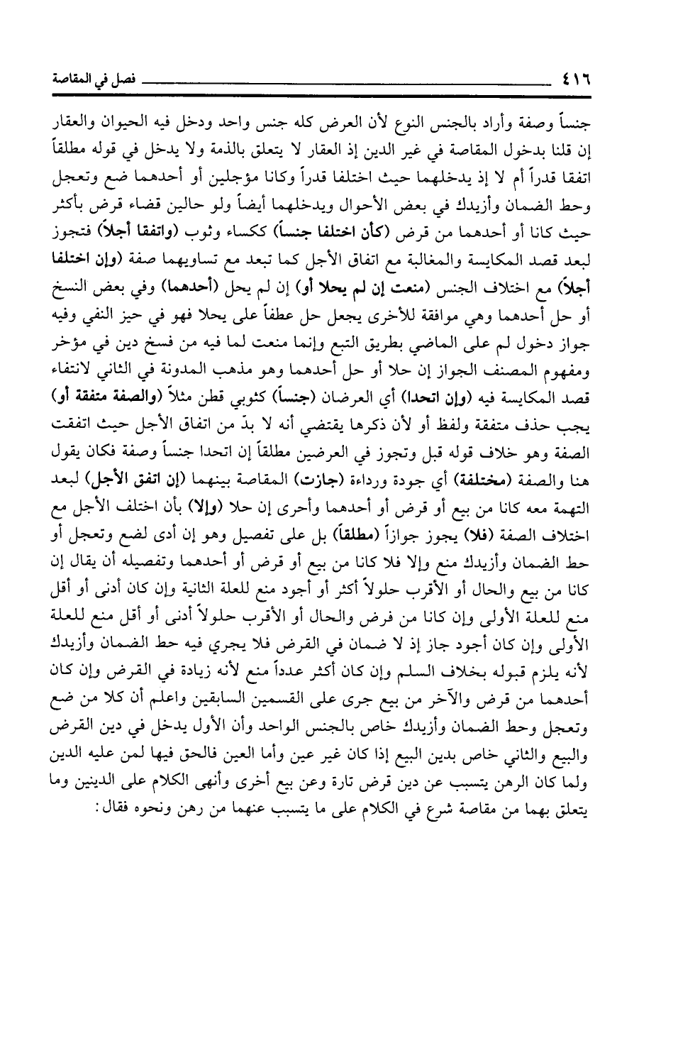 جنسًا وصفة وأراد بالجنس النوع لأن العرض كله جنس واحد ودخل فيه الحيوان والعقار إن قلنا بدخول المقاصة في غير الدين إذ العقار لا يتعلق بالذمة ولا يدخل في قوله مطلقًا اتفقا قدرًا أم لا إذ يدخلهما حيث اختلفا قدرًا وكانا مؤجلين أو أحدهما ضع وتعجل وحط الضمان وأزيدك في بعض الأحوال ويدخلهما أيضًا ولو حالين قضاء قرض بأكثر حيث كانا أو أحدهما من قرض (كان اختلفا جنسًا) ككساء وثوب (واتفقا أجلًا) فتجوز لبعد قصد المكايسة والمغالبة مع اتفاق الأجل كما تبعد مع تساويهما صفة (وإن اختلفا أجلًا) مع اختلاف الجنس (منعت إن لم يحلا أو) إن لم يحل (أحدهما) وفي بعض النسخ أو حل أحدهما وهي موافقة للأخرى يجعل حل عطفًا على يحلا فهو في حيز النفي وفيه جواز دخول لم على الماضي بطريق التبع وإنما منعت لما فيه من فسخ دين في مؤخر ومفهوم المصنف الجواز إن حلا أو حل أحدهما وهو مذهب المدونة في الثاني لانتفاء قصد المكايسة فيه (وإن اتحدا) أي العرضان (جنسًا) كثوبي قطن مثلًا (والصفة متفقة أو) يجب حذف متفقة ولفظ أو لأن ذكرها يقتضي أنه لا بد من اتفاق الأجل حيث اتفقت الصفة وهو خلاف قوله قبل وتجوز في العرضين مطلقًا إن اتحدا جنسًا وصفة فكان يقول هنا والصفة (مختلفة) أي جودة ورداءة (جازت) المقاصة بينهما (إن اتفق الأجل) لبعد التهمة معه كانا من بيع أو قرض أو أحدهما وأحرى إن حلا (وإلا) بأن اختلف الأجل مع اختلاف الصفة (فلا) يجوز جوازًا (مطلقًا) بل على تفصيل وهو إن أدى لضع وتعجل أو حط الضمان وأزيدك منع وإلا فلا كانا من بيع أو قرض أو أحدهما وتفصيله أن يقال إن كانا من بيع والحال أو الأقرب حلولًا أكثر أو أجود منع للعلة الثانية وإن كان أدنى أو أقل منع للعلة الأولى وإن كانا من فرض والحال أو الأقرب حلولًا أدنى أو أقل منع للعلة الأولى وإن كان أجود جاز إذ لا ضمان في القرض فلا يجري فيه حط الضمان وأزيدك لأنه يلزم قبوله بخلاف السلم وإن كان أكثر عددًا منع لأنه زيادة في القرض وإن كان أحدهما من قرض والآخر من بيع جرى على القسمين السابقين واعلم أن كلا من ضع وتعجل وحط الضمان وأزيدك خاص بالجنس الواحد وأن الأول يدخل في دين القرض والبيع والثاني خاص بدين البيع إذا كان غير عين وأما العين فالحق فيها لمن عليه الدين ولما كان الرهن يتسبب عن دين قرض تارة وعن بيع أخرى وأنهى الكلام على الدينين وما يتعلق بهما من مقاصة شرع في الكلام على ما يتسبب عنهما من رهن ونحوه فقال: