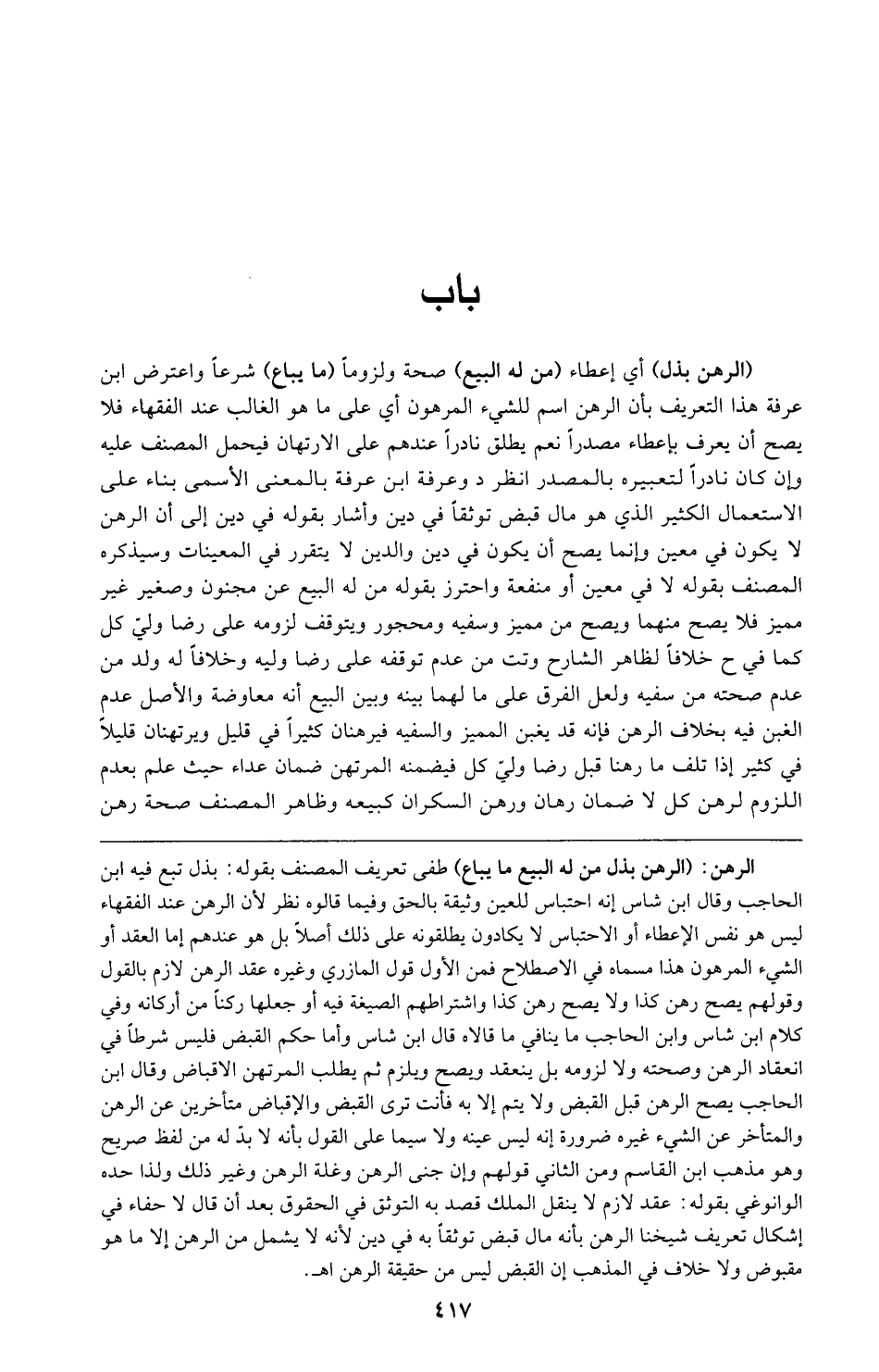 الرهن: (الرهن بذل من له البيع ما يباع) طفى تعريف المصنف بقوله: بذل تبع فيه ابن الحاحب وقال ابن شاس إنه احتباس للعين وثيقة بالحق وفيما قالوه نظر لأن الرهن عند الفقهاء ليس هو نفس الإعطاء أو الاحتباس لا يكادون يطلقونه على ذلك أصلًا بل هو عندهم إما العقد أو الشيء المرهون هذا مسماه في الاصطلاح فمن الأول قول المازري وغيره عقد الرهن لازم بالقول وقولهم يصح رهن كذا ولا يصح رهن كذا واشتراطهم الصيغة فيه أو جعلها ركنًا من أركانه وفي كلام ابن شاس وابن الحاجب ما ينافي ما قالاه قال ابن شاس وأما حكم القبض فليس شرطًا في انعقاد الرهن وصحته ولا لزومه بل ينعقد ويصح ويلزم ثم يطلب المرتهن الإقباض وقال ابن الحاجب يصح الرهن قبل القبض ولا يتم إلا به فأنت ترى القبض والإقباض متأخرين عن الرهن والمتأخر عن الشيء غيره ضرورة إنه ليس عينه ولا سيما على القول بأنه لا بد له من لفظ صريح وهو مذهب ابن القاسم ومن الثاني قولهم وإن جنى الرهن وغلة الرهن وغير ذلك ولذا حده الوانوغي بقوله: عقد لازم لا ينقل الملك قصد به التوثق في الحقوق بعد أن قال لا حفاء في إشكال تعريف شيخنا الرهن بأنه مال قبض توثقًا به في دين لأنه لا يشمل من الرهن إلا ما هو مقبوض ولا خلاف في المذهب إن القبض ليس من حقيقة الرهن اهـ.