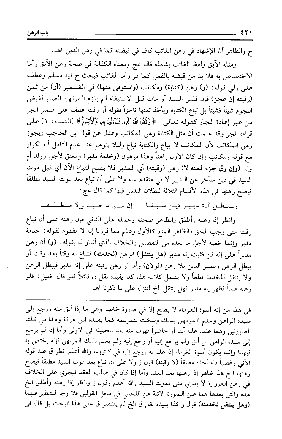 ومثله الآبق ولفظ الغائب يشمله قاله عج ومعناه الكفاية في صحة رهن الآبق وأما الاختصاص به فلا بد من قبضه بالفعل كما مر وأما الغائب فبحث ح فيه مسلم وعطف على ولي قوله: (و) رهن (كتابة) ومكاتب (واستوفى منها) في القسمير (أو) من ثمن (رقبته إن عجز) فإن فلس السيد أو مات قبل الاستيفاء لم يلزم المرتهن الصبر لقبض النجوم شيئًا فشيئًا بل تباع الكتابة ويأخذ ثمنها ناجزًا فقوله أو رقبته عطف على ضمير الجر من غير إعادة الجار كقوله تعالى: {وَاتَّقُوا اللَّهَ الَّذِي تَسَاءَلُونَ بِهِ وَالْأَرْحَامَ} [النساء: 1] على قراءة الجر وقد علمت أن مثل الكتابة رهن المكاتب وعدل عن قول ابن الحاجب ويجوز رهن المكاتب لأن المكاتب لا يباع والكتابة تباع ولئلا يتوهم عند عدم التأمل أنه تكرار مع قوله ومكاتب وإن كان الأول راهنًا وهذا مرهون (وخدمة مدبر) ومعتق لأجل وولد أم ولد (وإن رق جزء فمنه لا) رهن (رقبته) أي المدبر فلا يصح لتباع الآن أي قبل موت السيد في دين متأخر عن التدبير لا في متقدم عنه ولا على أن تباع بعد موت السيد مطلقًا فيصح رهنها في هذه الأقسام الثلاثة لبطلان التدبير فيها كما قال عج:
