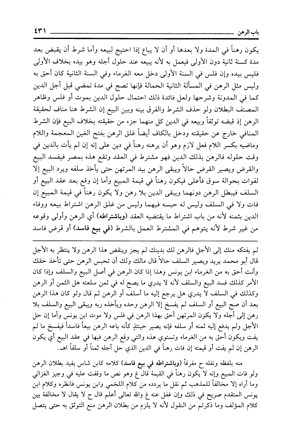 لم يفتكه منك إلى الأجل فالرهن لك بدينك لم يجز وينقض هذا الرهن ولا ينتظر به الأجل قال أبو محمَّد يريد ويصير السلف حالًا قال مالك ولك أن تحبس الرهن حتى تأخذ حقك وأنت أحق به من الغرماء ابن يونس وهذا إذا كان الرهن في أصل البيع والسلف وإذا كان الأمر كذلك فسد البيع والسلف لأنه لا يدري ما يصح له في ثمن سلعته هل الثمن أو الرهن وكذلك في السلف لا يدري هل يرجع إليه ما أسلف أو الرهن ثم قال ولو كان هذا الرهن بعد أن صح البيع أو السلف لم يفسخ إلا الرهن وحده ويأخذه ربه ويبقى البيع والسلف بلا رهن إلى أجله ولا يكون المرتهن أحق بهذا الرهن في فلس ولا موت ابن يونس وأما إن حل الأجل ولم يدفع إليه ثمنه أو سلفه فإنه يصير حينئذٍ كأنه باعه الرهن بيعًا فاسدًا فيفسخ ما لم يفت ويكون أحق به من الغرماء وتستوي هذه والتي وقع الرهن فيها في عقد البيع أي يكون الرهن إن لم يفت أو قيمته إن فات رهنًا في الدين الذي حل أجله ثمنًا أو سلفًا اهـ.