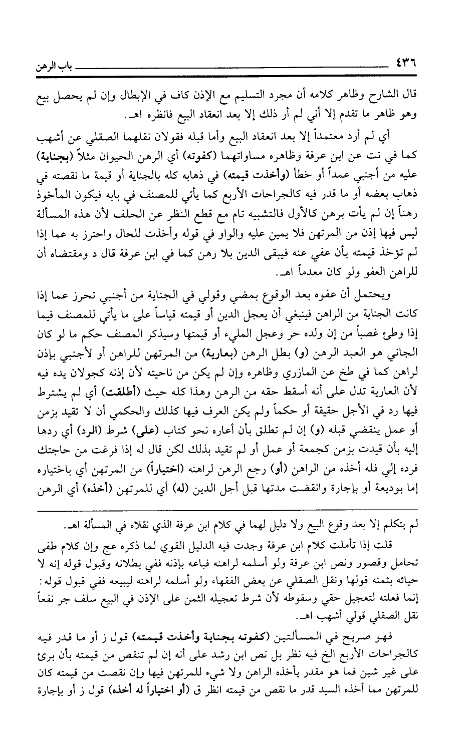 ويحتمل أن عفوه بعد الوقوع بمضي وقولي في الجناية من أجنبي تحرز عما إذا كانت الجناية من الراهن فينبغي أن يعجل الدين أو قيمته قياسًا على ما يأتي للمصنف فيما إذا وطئ غصبًا من إن ولده حر وعجل المليء أو قيمتها وسيذكر المصنف حكم ما لو كان الجاني هو العبد الرهن (و) بطل الرهن (بعارية) من المرتهن للراهن أو لأجنبي بإذن لراهن كما في طخ عن المازري وظاهره وإن لم يكن من ناحيته لأن إذنه كجولان يده فيه لأن العارية تدل على أنه أسقط حقه من الرهن وهذا كله حيث (أطلقت) أي لم يشترط فيها رد في الأجل حقيقة أو حكمًا ولم يكن العرف فيها كذلك والحكمي أن لا تقيد بزمن أو عمل ينقضي قبله (و) إن لم تطلق بأن أعاره نحو كتاب (على) شرط (الرد) أي ردها إليه بأن قيدت بزمن كجمعة أو عمل أو لم تقيد بذلك لكن قال له إذا فرغت من حاجتك فرده إلى فله أخذه من الراهن (أو) رجع الرهن لراهنه (اختيارًا) من المرتهن أي باختياره إما بوديعة أو بإجارة وانقضت مدتها قبل أجل الدين (له) أي للمرتهن (أخذه) أي الرهن