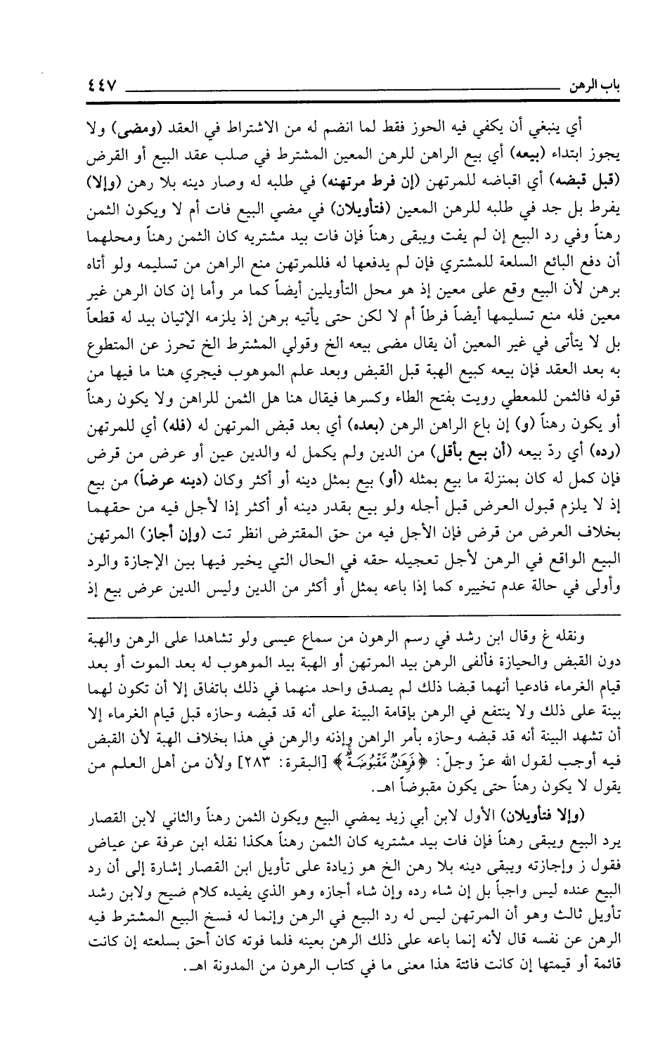 ونقله غ وقال ابن رشد في رسم الرهون من سماع عيسى ولو تشاهدا على الرهن والهبة دون القبض والحيازة فألفى الرهن بيد المرتهن أو الهبة بيد الموهوب له بعد الموت أو بعد قيام الغرماء فادعيا أنهما قبضا ذلك لم يصدق واحد منهما في ذلك باتفاق إلا أن تكون لهما بينة على ذلك ولا ينتفع في الرهن بإقامة البينة على أنه قد قبضه وحازه قبل قيام الغرماء إلا أن تشهد البينة أنه قد قبضه وحازه بأمر الراهن وإذنه والرهن في هذا بخلاف الهبة لأن القبض فيه أوجب لقول الله عزَّ وجلَّ: {فَرِهَانٌ مَقْبُوضَةٌ} [البقرة: 283] ولأن من أهل العلم من يقول لا يكون رهنًا حتى يكون مقبوضًا اهـ.