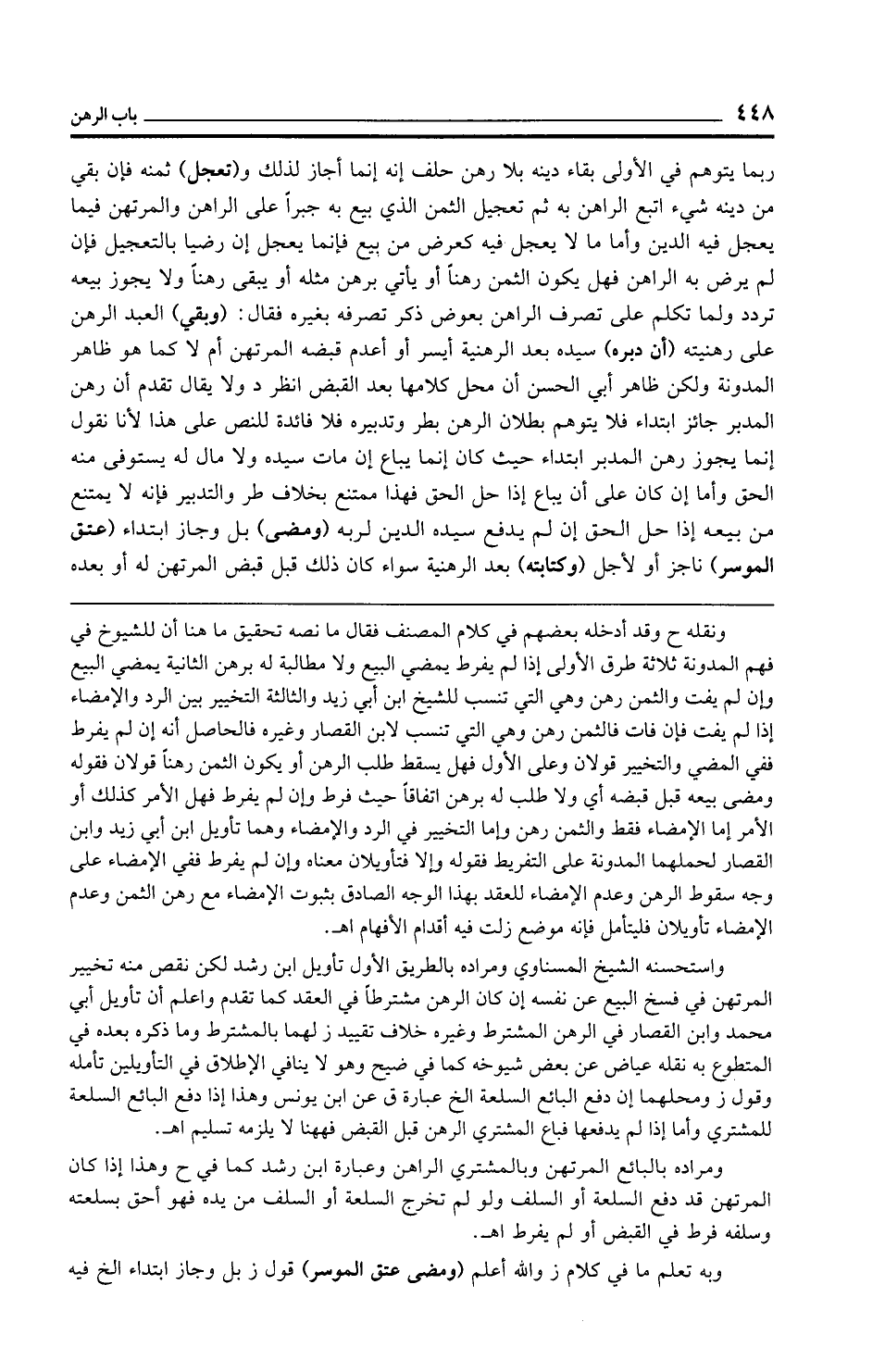 ونقله ح وقد أدخله بعضهم في كلام المصنف فقال ما نصه تحقيق ما هنا أن للشيوخ في فهم المدونة ثلاثة طرق الأولى إذا لم يفرط يمضي البيع ولا مطالبة له برهن الثانية يمضي البيع وإن لم يفت والثمن رهن وهي التي تنسب للشيخ ابن أبي زيد والثالثة التخيير بين الرد والإمضاء إذا لم يفت فإن فات فالثمن رهن وهي التي تنسب لابن القصار وغيره فالحاصل أنه إن لم يفرط ففي المضي والتخيير قولان وعلى الأول فهل يسقط طلب الرهن أو يكون الثمن رهنًا قولان فقوله ومضى بيعه قبل قبضه أي ولا طلب له برهن اتفاقًا حيث فرط وإن لم يفرط فهل الأمر كذلك أو الأمر إما الإمضاء فقط والثمن رهن وإما التخيير في الرد والإمضاء وهما تأويل ابن أبي زيد وابن القصار لحملهما المدونة على التفريط فقوله وإلا فتأويلان معناه وإن لم يفرط ففي الإمضاء على وجه سقوط الرهن وعدم الإمضاء للعقد بهذا الوجه الصادق بثبوت الإمضاء مع رهن الثمن وعدم الإمضاء تأويلان فليتأمل فإنه موضع زلت فيه أقدام الأفهام اهـ.