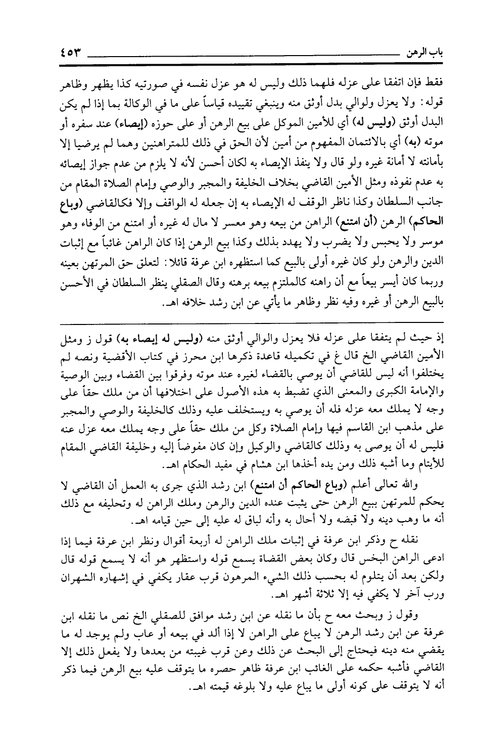 وقول ز وبحث معه ح لأن ما نقله عن ابن رشد موافق للصقلي الخ نص ما نقله ابن عرفة عن ابن رشد الرهن لا يباع على الراهن لا إذا ألد في بيعه أو عاب ولم يوجد له ما يقضي منه دينه فيحتاج إلى البحث عن ذلك وعن قرب غيبته من بعدها ولا يفعل ذلك إلا القاضي فأشبه حكمه على الغائب ابن عرفة ظاهر حصره ما يتوقف عليه بيع الرهن فيما ذكر أنه لا يتوقف على كونه أولى ما يباع عليه ولا بلوغه قيمته اهـ.