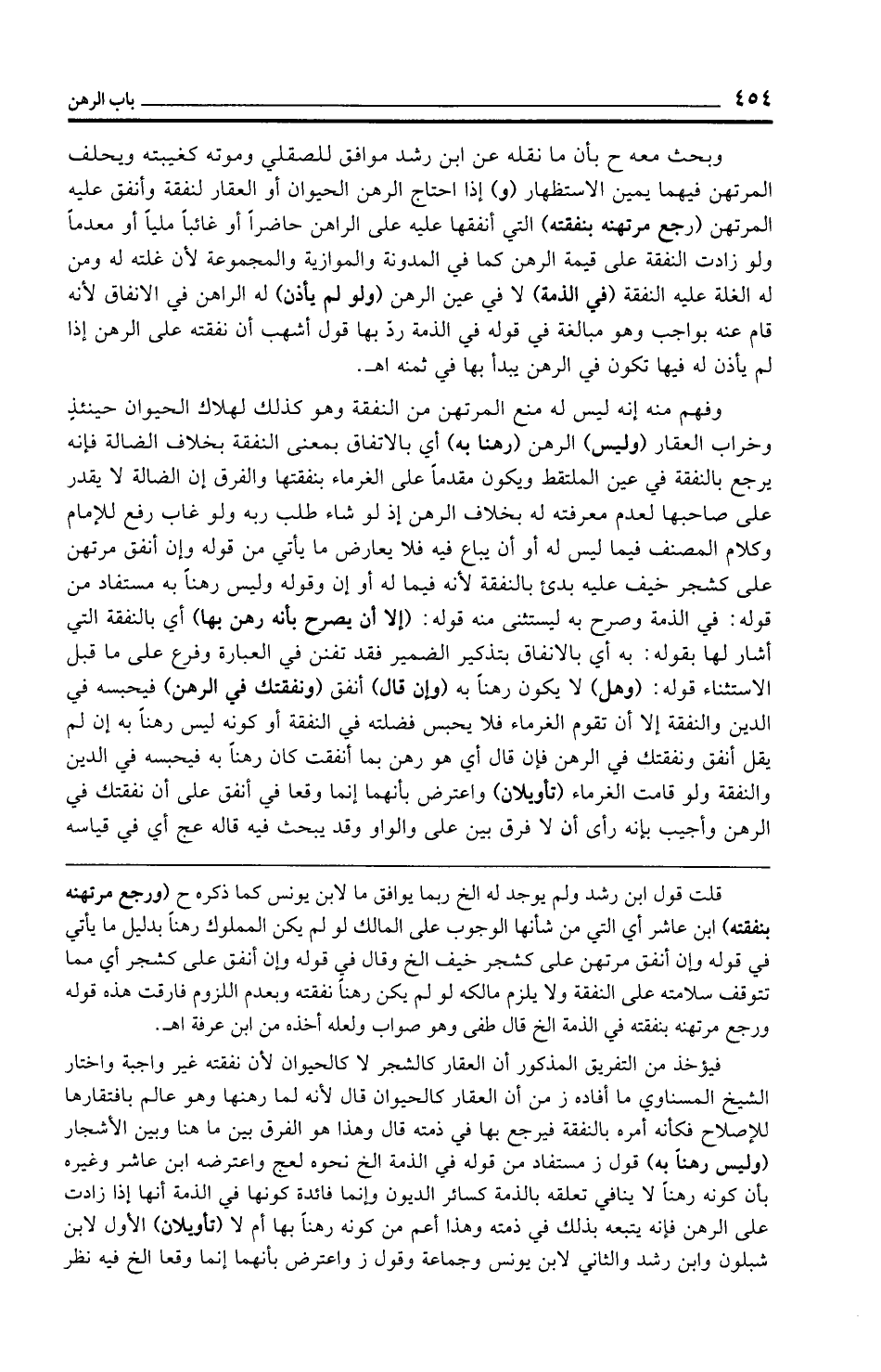 فيؤخذ من التفريق المذكور أن العقار كالشجر لا كالحيوان لأن نفقته غير واجبة واختار الشيخ المسناوي ما أفاده ز من أن العقار كالحيوان قال لأنه لما رهنها وهو عالم بافتقارها للإصلاح فكأنه أمره بالنفقة فيرجع بها في ذمته قال وهذا هو الفرق بين ما هنا وبين الأشجار (وليس رهنًا به) قول ز مستفاد من قوله في الذمة الخ نحوه لعج واعترضه ابن عاشر وغيره بأن كونه رهنًا لا ينافي تعلقه بالذمة كسائر الديون وإنما فائدة كونها في الذمة أنها إذا زادت على الرهن فإنه يتبعه بذلك في ذمته وهذا أعم من كونه رهنًا بها أم لا (تأويلان) الأول لابن شبلون وابن رشد والثاني لابن يونس وجماعة وقول ز واعترض بأنهما إنما وقعا الخ فيه نظر