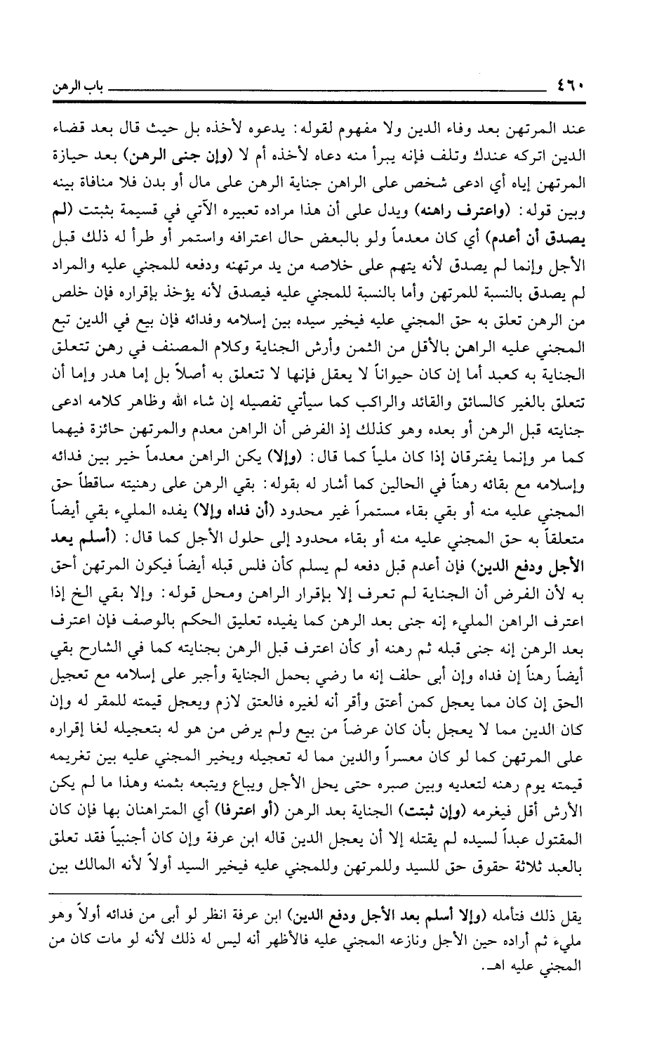 عند المرتهن بعد وفاء الدين ولا مفهوم لقوله: يدعوه لأخذه بل حيث قال بعد قضاء الدين اتركه عندك وتلف فإنه يبرأ منه دعاه لأخذه أم لا (وإن جنى الرهن) بعد حيازة المرتهن إياه أي ادعى شخص على الراهن جناية الرهن على مال أو بدن فلا منافاة بينه وبين قوله: (واعترف راهنه) ويدل على أن هذا مراده تعبيره الآتي في قسيمة بثبتت (لم يصدق أن أعدم) أي كان معدمًا ولو بالبعض حال اعترافه واستمر أو طرأ له ذلك قبل الأجل وإنما لم يصدق لأنه يتهم على خلاصه من يد مرتهنه ودفعه للمجني عليه والمراد لم يصدق بالنسبة للمرتهن وأما بالنسبة للمجني عليه فيصدق لأنه يؤخذ بإقراره فإن خلص من الرهن تعلق به حق المجني عليه فيخير سيده بين إسلامه وفدائه فإن بيع في الدين تبع المجني عليه الراهن بالأقل من الثمن وأرش الجناية وكلام المصنف في رهن تتعلق الجناية به كعبد أما إن كان حيوانًا لا يعقل فإنها لا تتعلق به أصلًا بل إما هدر وإما أن تتعلق بالغير كالسائق والقائد والراكب كما سيأتي تفصيله إن شاء الله وظاهر كلامه ادعى جنايته قبل الرهن أو بعده وهو كذلك إذ الفرض أن الراهن معدم والمرتهن حائزة فيهما كما مر وإنما يفترقان إذا كان مليًّا كما قال: (وإلا) يكن الراهن معدمًا خير بين فدائه وإسلامه مع بقائه رهنًا في الحالين كما أشار له بقوله: بقي الرهن على رهنيته ساقطًا حق المجني عليه منه أو بقي بقاء مستمرًا غير محدود (أن فداه وإلا) يفده المليء بقي أيضًا متعلقًا به حق المجني عليه منه أو بقاء محدود إلى حلول الأجل كما قال: (أسلم يعد الأجل ودفع الدين) فإن أعدم قبل دفعه لم يسلم كأن فلس قبله أيضًا فيكون المرتهن أحق به لأن الفرض أن الجناية لم تعرف إلا بإقرار الراهن ومحل قوله: وإلا بقي الخ إذا اعترف الراهن المليء إنه جنى بعد الرهن كما يفيده تعليق الحكم بالوصف فإن اعترف بعد الرهن إنه جنى قبله ثم رهنه أو كأن اعترف قبل الرهن بجنايته كما في الشارح بقي أيضًا رهنًا إن فداه وإن أبى حلف إنه ما رضي يحمل الجناية وأجبر على إسلامه مع تعجيل الحق إن كان مما يعجل كمن أعتق وأقر أنه لغيره فالعتق لازم ويعجل قيمته للمقر له وإن كان الدين مما لا يعجل بان كان عرضًا من بيع ولم يرض من هو له بتعجيله لغا إقراره على المرتهن كما لو كان معسرًا والدين مما له تعجيله ويخير المجني عليه بين تغريمه قيمته يوم رهنه لتعديه وبين صبره حتى يحل الأجل ويباع ويتبعه بثمنه وهذا ما لم يكن الأرش أقل فيغرمه (وإن ثبتت) الجناية بعد الرهن (أو اعترفا) أي المتراهنان بها فإن كان المقتول عبدًا لسيده لم يقتله إلا أن يعجل الدين قاله ابن عرفة وإن كان أجنبيًّا فقد تعلق بالعبد ثلاثة حقوق حق للسيد وللمرتهن وللمجني عليه فيخير السيد أولًا لأنه المالك بين