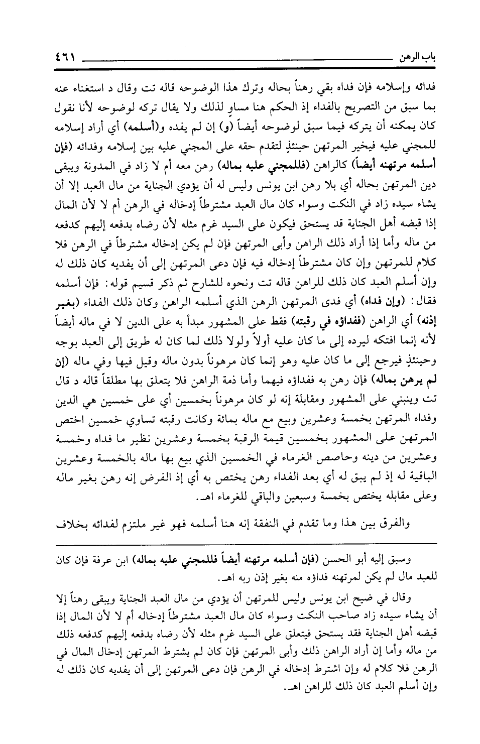 فدائه وإسلامه فإن فداه بقي رهنًا بحاله وترك هذا لوضوحه قاله تت وقال د استغناء عنه بما سبق من التصريح بالفداء إذ الحكم هنا مساو لذلك ولا يقال تركه لوضوحه لأنا نقول كان يمكنه أن يتركه فيما سبق لوضوحه أيضًا (و) إن لم يفده و (أسلمه) أي أراد إسلامه للمجني عليه فيخير المرتهن حينئذٍ لتقدم حقه على المجني عليه بين إسلامه وفدائه (فإن أسلمه مرتهنه أيضًا) كالراهن (فللمجني عليه بماله) رهن معه أم لا زاد في المدونة ويبقى دين المرتهن بحاله أي بلا رهن ابن يونس وليس له أن يؤدي الجناية من مال العبد إلا أن يشاء سيده زاد في النكت وسواء كان مال العبد مشترطًا إدخاله في الرهن أم لا لأن المال إذا قبضه أهل الجناية قد يستحق فيكون على السيد غرم مثله لأن رضاه بدفعه إليهم كدفعه من ماله وأما إذا أراد ذلك الراهن وأبى المرتهن فإن لم يكن إدخاله مشترطًا في الرهن فلا كلام للمرتهن وإن كان مشترطًا إدخاله فيه فإن دعى المرتهن إلى أن يفديه كان ذلك له وإن أسلم العبد كان ذلك للراهن قاله تت ونحوه للشارح ثم ذكر قسيم قوله: فإن أسلمه فقال: (وإذ فداه) أي فدى المرتهن الرهن الذي أسلمه الراهن وكان ذلك الفداء (بغير إذنه) أي الراهن (ففداؤه في رقبته) فقط على المشهور مبدأ به على الدين لا في ماله أيضًا لأنه إنما افتكه ليرده إلى ما كان عليه أولًا ولولا ذلك لما كان له طريق إلى العبد بوجه وحينئذٍ فيرجع إلى ما كان عليه وهو إنما كان مرهونًا بدون ماله وقيل فيها وفي ماله (إن لم يرهن بماله) فإن رهن به ففداؤه فيهما وأما ذمة الراهن فلا يتعلق بها مطلقًا قاله د قال تت وينبني على المشهور ومقابلة إنه لو كان مرهونًا بخمسين أي على خمسين هي الدين وفداه المرتهن بخمسة وعشرين وبيع مع ماله بمائة وكانت رقبته تساوي خمسين اختص المرتهن على المشهور بخمسين قيمة الرقبة بخمسة وعشرين نظير ما فداه وخمسة وعشرين من دينه وحاصص الغرماء في الخمسين الذي بيع بها ماله بالخمسة وعشرين الباقية له إذ لم يبق له أي بعد الفداء رهن يختص به أي إذ الفرض إنه رهن بغير ماله وعلى مقابله يختص بخمسة وسبعين والباقي للغرماء اهـ.