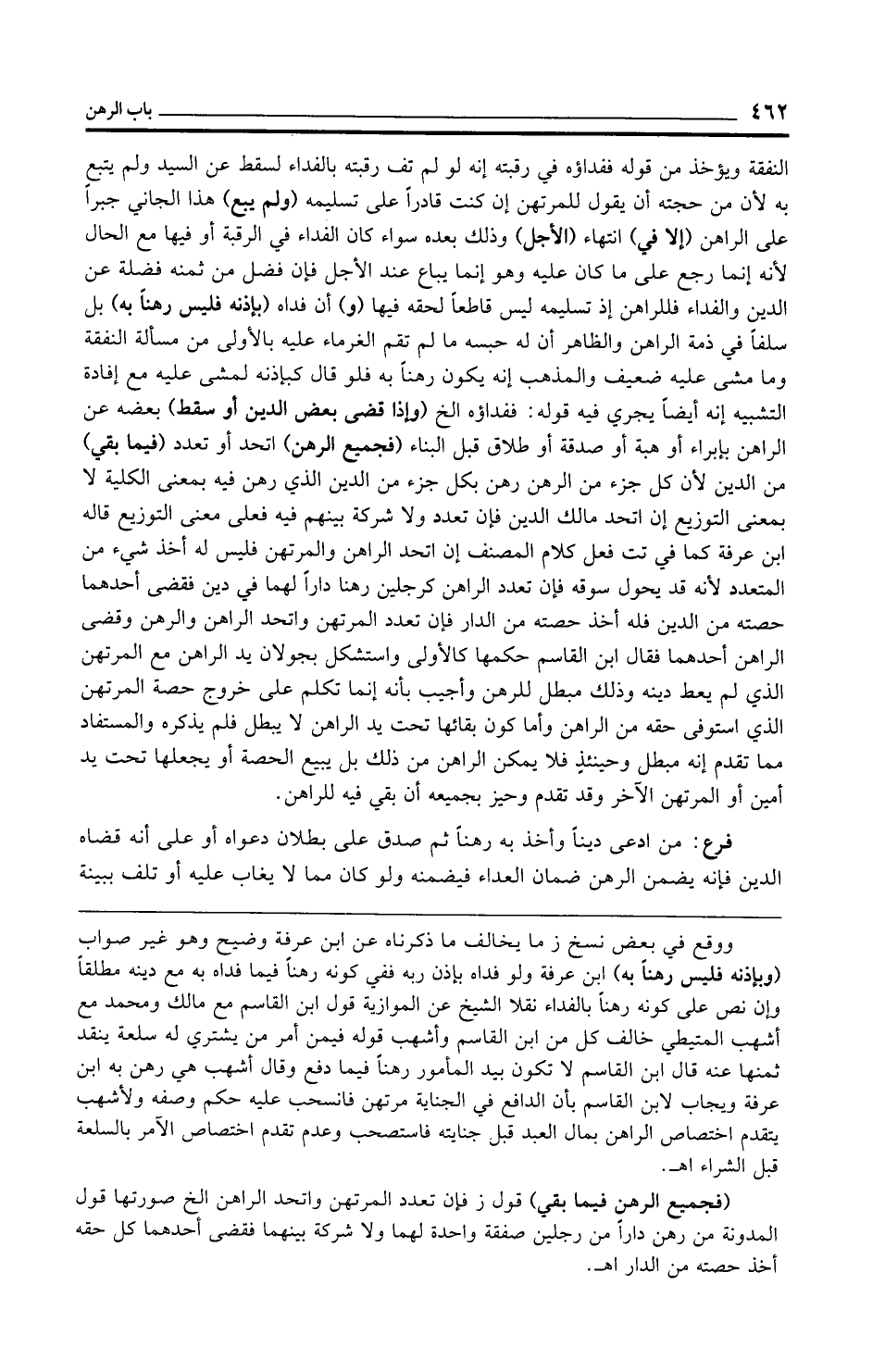 ووقع في بعض نسخ ز ما يخالف ما ذكرناه عن ابن عرفة وضيح وهو غير صواب (وبإذنه فليس رهنًا به) ابن عرفة ولو فداه بإذن ربه ففي كونه رهنًا فيما فداه به مع دينه مطلقًا وإن نص على كونه رهنًا بالفداء نقلا الشيخ عن الموازية قول ابن القاسم مع مالك ومحمد مع أشهب المتيطي خالف كل من ابن القاسم وأشهب قوله فيمن أمر من يشتري له سلعة ينقد ثمنها عنه قال ابن القاسم لا تكون بيد المأمور رهنًا فيما دفع وقال أشهب هي رهن به ابن عرفة ويجاب لابن القاسم بأن الدافع في الجناية مرتهن فانسحب عليه حكم وصفه ولأشهب يتقدم اختصاص الراهن بمال العبد قبل جنايته فاستصحب وعدم تقدم اختصاص الآمر بالسلعة قبل الشراء اهـ.