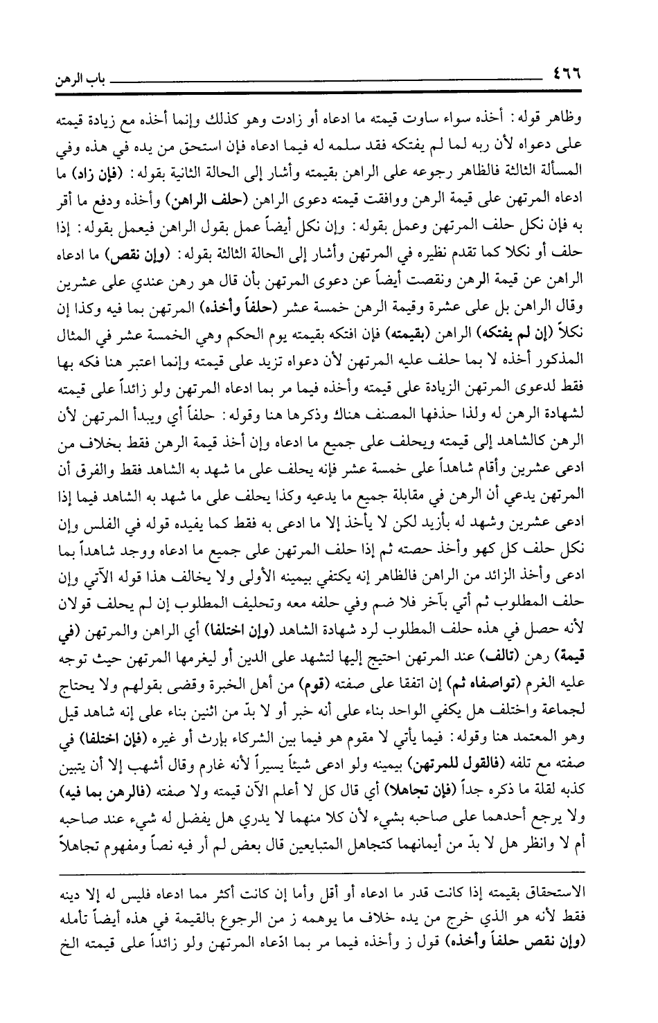 وظاهر قوله: أخذه سواء ساوت قيمته ما ادعاه أو زادت وهو كذلك وإنما أخذه مع زيادة قيمته على دعواه لأن ربه لما لم يفتكه فقد سلمه له فيما ادعاه فإن استحق من يده في هذه وفي المسألة الثالثة فالظاهر رجوعه على الراهن بقيمته وأشار إلى الحالة الثانية بقوله: (فإن زاد) ما ادعاه المرتهن على قيمة الرهن ووافقت قيمته دعوى الراهن (حلف الراهن) وأخذه ودفع ما أقر به فإن نكل حلف المرتهن وعمل بقوله: وإن نكل أيضًا عمل بقول الراهن فيعمل بقوله: إذا حلف أو نكلا كما تقدم نظيره في المرتهن وأشار إلى الحالة الثالثة بقوله: (وإن نقص) ما ادعاه الراهن عن قيمة الرهن ونقصت أيضًا عن دعوى المرتهن بأن قال هو رهن عندي على عشرين وقال الراهن بل على عشرة وقيمة الرهن خمسة عشر (حلفًا وأخذه) المرتهن بما فيه وكذا إن نكلًا (إن لم يفتكه) الراهن (بقيمته) فإن افتكه بقيمته يوم الحكم وهي الخمسة عشر في المثال المذكور أخذه لا بما حلف عليه المرتهن لأن دعواه تزيد على قيمته وإنما اعتبر هنا فكه بها فقط لدعوى المرتهن الزيادة على قيمته وأخذه فيما مر بما ادعاه المرتهن ولو زائدًا على قيمته لشهادة الرهن له ولذا حذفها المصنف هناك وذكرها هنا وقوله: حلفًا أي ويبدأ المرتهن لأن الرهن كالشاهد إلى قيمته ويحلف على جميع ما ادعاه وإن أخذ قيمة الرهن فقط بخلاف من ادعى عشرين وأقام شاهدًا على خمسة عشر فإنه يحلف على ما شهد به الشاهد فقط والفرق أن المرتهن يدعي أن الرهن في مقابلة جميع ما يدعيه وكذا يحلف على ما شهد به الشاهد فيما إذا ادعى عشرين وشهد له بأزيد لكن لا يأخذ إلا ما ادعى به فقط كما يفيده قوله في الفلس وإن نكل حلف كل كهو وأخذ حصته ثم إذا حلف المرتهن على جميع ما ادعاه ووجد شاهدًا بما ادعى وأخذ الزائد من الراهن فالظاهر إنه يكتفي بيمينه الأولى ولا يخالف هذا قوله الآتي وإن حلف المطلوب ثم أتي بآخر فلا ضم وفي حلفه معه وتحليف المطلوب إن لم يحلف قولان لأنه حصل في هذه حلف المطلوب لرد شهادة الشاهد (وإن اختلفا) أي الراهن والمرتهن (في قيمة) رهن (تالف) عند المرتهن احتيج إليها لتشهد على الدين أو ليغرمها المرتهن حيث توجه عليه الغرم (تواصفاه ثم) إن اتفقا على صفته (قوم) من أهل الخبرة وقضى بقولهم ولا يحتاج لجماعة واختلف هل يكفي الواحد بناء على أنه خبر أو لا بد من اثنين بناء على إنه شاهد قيل وهو المعتمد هنا وقوله: فيما يأتي لا مقوم هو فيما بين الشركاء بإرث أو غيره (فإن اختلفا) في صفته مع تلفه (فالقول للمرتهن) بيمينه ولو ادعى شيئًا يسيرًا لأنه غارم وقال أشهب إلا أن يتبين كذبه لقلة ما ذكره جدًّا (فإن تجاهلا) أي قال كل لا أعلم الآن قيمته ولا صفته (فالرهن بما فيه) ولا يرجع أحدهما على صاحبه بشيء لأن كلا منهما لا يدري هل يفضل له شيء عند صاحبه أم لا وانظر هل لا بد من أيمانهما كتجاهل المتبايعين قال بعض لم أر فيه نصًّا ومفهوم تجاهلًا