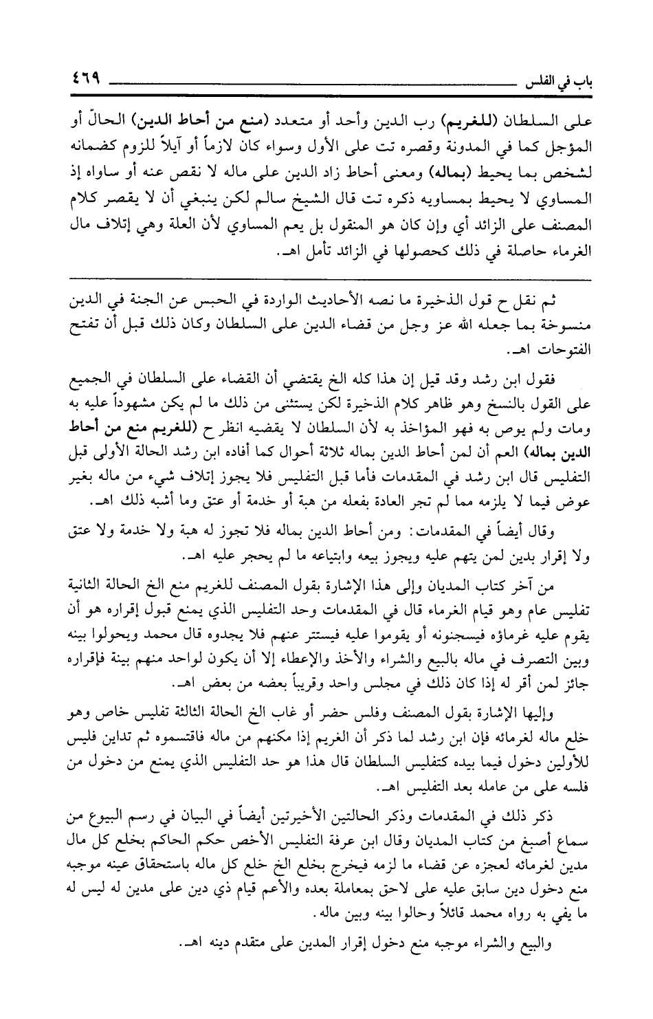 فقول ابن رشد وقد قيل إن هذا كله الخ يقتضي أن القضاء على السلطان في الجميع على القول بالنسخ وهو ظاهر كلام الذخيرة لكن يستثنى من ذلك ما لم يكن مشهودًا عليه به ومات ولم يوص به فهو المؤاخذ به لأن السلطان لا يقضيه انظر ح (للغريم منع من أحاط الدين بماله) العم أن لمن أحاط الدين بماله ثلاثة أحوال كما أفاده ابن رشد الحالة الأولى قبل التفليس قال ابن رشد في المقدمات فأما قبل التفليس فلا يجوز إتلاف شيء من ماله بغير عوض فيما لا يلزمه مما لم تجر العادة بفعله من هبة أو خدمة أو عتق وما أشبه ذلك اهـ.