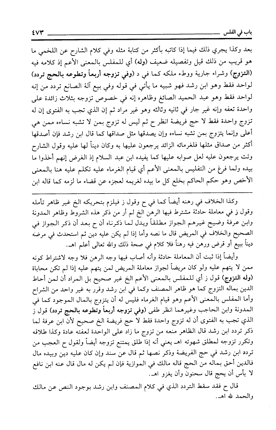 وأيضًا إذا ثبت أن المعاملة حادثة وأنه أصاب فيها وجه الرهن فلا وجه لاشتراط كونه ممن لا يتهم عليه ولو كان مريضًا لجواز معاملة المريض لمن يتهم عليه إذا لم تكن محاباة (وله التزوج) قول ز أي للمفلس بالمعنى الأعم الخ غير صحيح بل المراد أن لمن أحاط الدين بماله التزوج كما هو ظاهر المصنف وكما في ابن رشد وقرر به غير واحد من الشراح وأما المفلس بالمعنى الأعم وهو قيام الغرماء فليس له أن يتزوج بالمال الموجود كما في المدونة وابن الحاجب وغيرهما انظر طفى (وفي تزوجه أربعًا وتطوعه بالحج تردد) قول ز الذي تجب به الفتوى أن له تزوج واحدة فقط لا حج فريضة الخ صحيح لأن ابن عرفة لما ذكر تردد ابن رشد قال الظاهر منعه من تزوج ما زاد على الواحدة لعفته عادة وكذا طلاقه وتكرر تزوجه لمطلق شهوته اهـ يعني أنه إذا طلق يمتنع تزوجه أيضًا ولقول ح العجب من تردد ابن رشد في حج الفريضة وذكر نصها ثم قال عن سند وإن كان عليه دين وبيده مال فالدين أحق بماله من الحج قاله مالك في الموازية فإن لم يكن له مال قال عنه ابن نافع لا بأس أن يحج قال سحنون وأن يغزو اهـ.