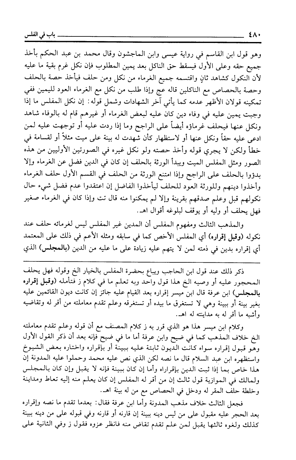 والمذهب الثالث ومفهوم المفلس أن المدين غير المفلس ليس لغرمائه حلف عند نكوله (وقبل إقراره) أي المفلس الأخص كما في سابقه ومثله الأعم في ذلك على المعتمد أي إقراره بدين في ذمته لمن لا يتهم عليه زيادة على ما عليه من الدين (بالمجلس) الذي
