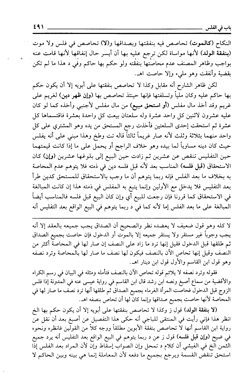 (لا بنفقة الولد) قول ز وكذا لا تحاصص بنفقتها على أبويه إلا أن يكون حكم بها الخ انظر هذا فإني رأيت في المنتقى للباجي أنه حكى هذا التفصيل عن أصبغ بعد أن نقل عن رواية ابن القاسم أنها لا تحاصص بنفقة الأبوين مطلقًا ووجه كلا من القولين فانظره ونحوه في ضيح (وإن قبل فلسه) قول ز عن د ربما يتوهم في البيع الواقع بعد التفليس أنه يرد جميع الثمن الخ في الفيشي أن كلام د تمحل وإن الصواب إسقاط وإن لأن المراد بعد الفلس إذا استحق تنقض القسمة ويرجع بجميع ما دفعه لأن المعاملة إنما هي بينه وبين الحاكم لا