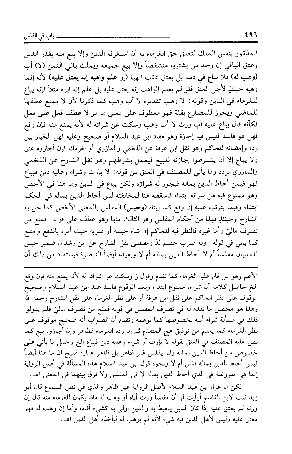 المذكور بنفس الملك لتعلق حق الغرماء به أن استغرقه الدين وإلا بيع منه بقدر الدين وعتق الباقي إن وجد من يشتريه متشقصًا د إلا بيع جميعه ويملك باقي الثمن (لا) أب (وهب له) فلا يباع في دينه بل يعتق عقب الهبة (إن علم واهبه إنه يعتق عليه) لأنه إنما وهبه حينئذٍ لأجل العتق فلو لم يعلم الواهب إنه يعتق عليه بل علم إنه أبوه مثلًا فإنه يباع للغرماء في الدين وقوله: لا وهب تقديره لا أب وهب كما ذكرنا لأن لا يمنع عطفها للماضي ويحوز للمضارع بقلة فهو معطوف على معنى ما مر لا عطف فعل على فعل فكأنه قال يباع عليه أب ورث لا أب وهب وسكت عن شرائه له لأنه يمنع منه فإن وقع فهل هو فاسد فليس فيه إجازة وهو مفاد ابن عبد السلام أو صحيح وعليه فهل الخيار بين رده وإمضائه للحاكم وهو نقل ابن عرفة عن اللخمي والمازري أو لغرمائه فإن أجازوه عتق ولا يباع إلا أن يشترطوا إجازته للبيع فيعمل بشرطهم وهو نقل الشارح عن اللخمي والمازري تردد وما يأتي للمصنف في العتق من قوله: لا بإرث وشراء وعليه دين فيباع فهو فيمن أحاط الدين بماله فيجوز له شراؤه ولكن يباع في الدين وما هنا في الأخص وهو ممنوع فيه من شرائه ابتداء فأسقطه هنا لمخالفته لمن أحاط الدين بماله في الحكم ابتداء وفيما يترتب عليه إن وقع كما بيناه (وحبس) المفلس بالمعنى الأخص كما حل به الشارح وحينئذٍ فهذا من أحكام المفلس وهو الثالث منها وهو عطف على قوله: فمنع من تصرف ماليّ وأما غيره فالنظر فيه للحاكم إن شاء حبسه أو ضربه حيث أمره بالدفع وامتنع كما يأتي في قوله: وله ضرب خصم لدّ ومقتضى نقل الشارح عن ابن رشدان ضمير حبس للمديان مفلسًا أم لا أحاط الدين بماله أم لا ويفيده أيضًا التبصرة فيستفاد من ذلك أن