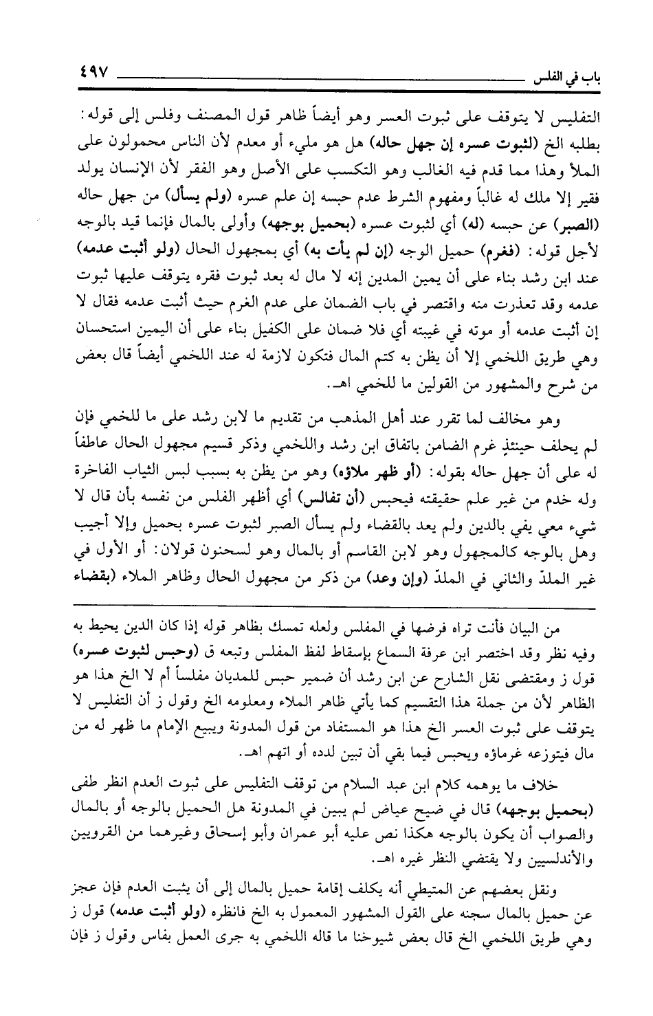 من البيان فأنت تراه فرضها في المفلس ولعله تمسك بظاهر قوله إذا كان الدين يحيط به وفيه نظر وقد اختصر ابن عرفة السماع بإسقاط لفظ المفلس وتبعه ق (وحبس لثبوت عسره) قول ز ومقتضى نقل الشارح عن ابن رشد أن ضمير حبس للمديان مفلسًا أم لا الخ هذا هو الظاهر لأن من جملة هذا التقسيم كما يأتي ظاهر الملاء ومعلومه الخ وقول ز أن التفليس لا يتوقف على ثبوت العسر الخ هذا هو المستفاد من قول المدونة ويبيع الإِمام ما ظهر له من مال فيتوزعه غرماؤه ويحبس فيما بقي أن تبين لدده أو اتهم اهـ.
