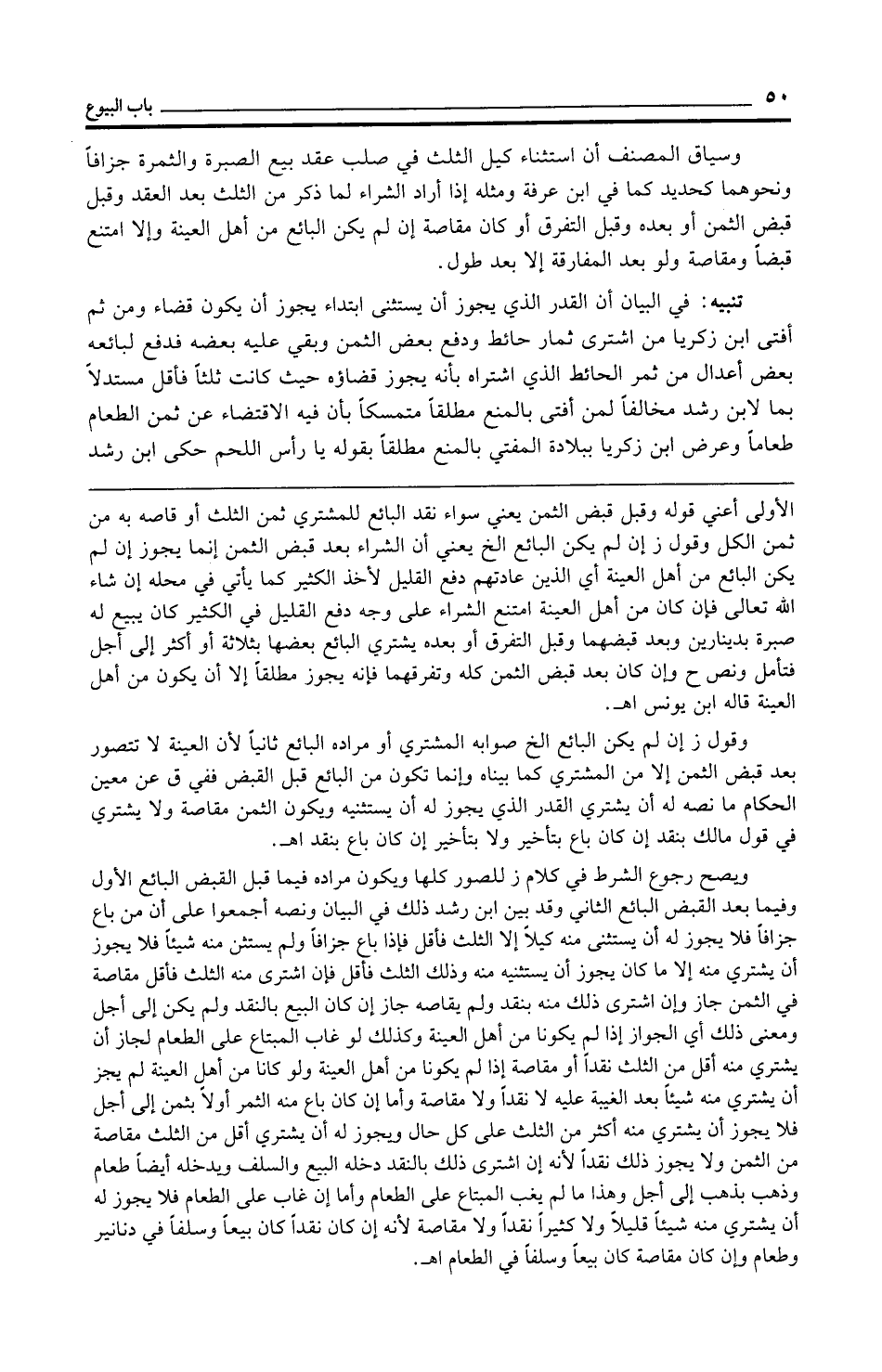 ويصح رجوع الشرط في كلام ز للصور كلها ويكون مراده فيما قبل القبض البائع الأول وفيما بعد القبض البائع الثاني وقد بين ابن رشد ذلك في البيان ونصه أجمعوا على أن من باع جزافًا فلا يجوز له أن يستثنى منه كيلًا إلا الثلث فأقل فإذا باع جزافًا ولم يستثن منه شيئًا فلا يجوز أن يشتري منه إلا ما كان يجوز أن يستثنيه منه وذلك الثلث فأقل فإن اشترى منه الثلث فأقل مقاصة في الثمن جاز وإن اشترى ذلك منه بنقد ولم يقاصه جاز إن كان البيع بالنقد ولم يكن إلى أجل ومعنى ذلك أي الجواز إذا لم يكونا من أهل العينة وكذلك لو غاب المبتاع على الطعام لجاز أن يشتري منه أقل من الثلث نقدًا أو مقاصة إذا لم يكونا من أهل العينة ولو كانا من أهل العينة لم يجز أن يشتري منه شيئًا بعد الغيبة عليه لا نقدًا ولا مقاصة وأما إن كان باع منه الثمر أولًا بثمن إلى أجل فلا يجوز أن يشتري منه أكثر من الثلث على كل حال ويجوز له أن يشتري أقل من الثلث مقاصة من الثمن ولا يجوز ذلك نقدًا لأنه إن اشترى ذلك بالنقد دخله البيع والسلف ويدخله أيضًا طعام وذهب بذهب إلى أجل وهذا ما لم يغب المبتاع على الطعام وأما إن غاب على الطعام فلا يجوز له أن يشتري منه شيئًا قليلًا ولا كثيرًا نقدًا ولا مقاصة لأنه إن كان نقدًا كان بيعًا وسلفًا في دنانير وطعام وإن كان مقاصة كان بيعًا وسلفًا في الطعام اهـ.