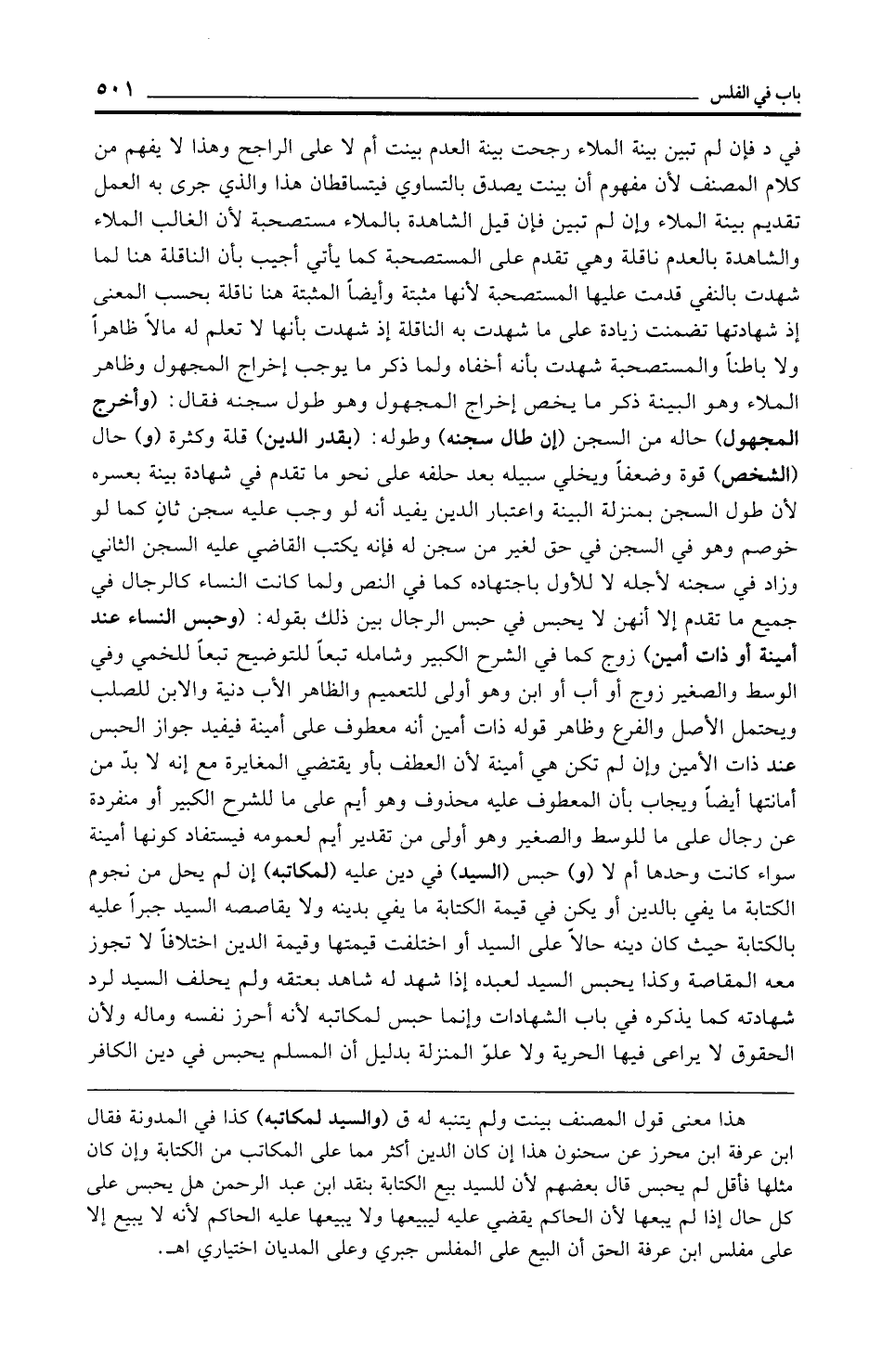 في د فإن لم تبين بينة الملاء رجحت بينة العدم بينت أم لا على الراجح وهذا لا يفهم من كلام المصنف لأن مفهوم أن بينت يصدق بالتساوي فيتساقطان هذا والذي جرى به العمل تقديم بينة الملاء وإن لم تبين فإن قيل الشاهدة بالملاء مستصحبة لأن الغالب الملاء والشاهدة بالعلم ناقلة وهي تقدم على المستصحبة كما يأتي أجيب بأن الناقلة هنا لما شهدت بالنفي قدمت عليها المستصحبة لأنها مثبتة وأيضًا المثبتة هنا ناقلة بحسب المعنى إذ شهادتها تضمنت زيادة على ما شهدت به الناقلة إذ شهدت بأنها لا تعلم له مالًا ظاهرًا ولا باطنًا والمستصحبة شهدت بأنه أخفاه ولما ذكر ما يوجب إخراج المجهول وظاهر الملاء وهو البينة ذكر ما يخص إخراج المجهول وهو طول سجنه فقال: (وأخرج المجهول) حاله من السجن (إن طال سجنه) وطوله: (بقدر الدين) قلة وكثرة (و) حال (الشخص) قوة وضعفًا ويخلي سبيله بعد حلفه على نحو ما تقدم في شهادة بينة بعسره لأن طول السجن بمنزلة البينة واعتبار الدين يفيد أنه لو وجب عليه سجن ثانٍ كما لو خوصم وهو في السجن في حق لغير من سجن له فإنه يكتب القاضي عليه السجن الثاني وزاد في سجنه لأجله لا للأول باجتهاده كما في النص ولما كانت النساء كالرجال في جميع ما تقدم إلا أنهن لا يحبس في حبس الرجال بين ذلك بقوله: (وحبس النساء عند أمينة أو ذات أمين) زوج كما في الشرح الكبير وشامله تبعًا للتوضيح تبعًا للخمي وفي الوسط والصغير زوج أو أب أو ابن وهو أولى للتعميم والظاهر الأب دنية والابن للصلب ويحتمل الأصل والفرع وظاهر قوله ذات أمين أنه معطوف على أمينة فيفيد جواز الحبس عند ذات الأمين وإن لم تكن هي أمينة لأن العطف بأو يقتضي المغايرة مع إنه لا بدّ من أمانتها أيضًا ويجاب بأن المعطوف عليه محذوف وهو أيم على ما للشرح الكبير أو منفردة عن رجال على ما للوسط والصغير وهو أولى من تقدير أيم لعمومه فيستفاد كونها أمينة سواء كانت وحدها أم لا (و) حبس (السيد) في دين عليه (لمكاتبه) إن لم يحل من نجوم الكتابة ما يفي بالدين أو يكن في قيمة الكتابة ما يفي بدينه ولا يقاصصه السيد جبرًا عليه بالكتابة حيث كان دينه حالًا على السيد أو اختلفت قيمتها وقيمة الدين اختلافًا لا تجوز معه المقاصة وكذا يحبس السيد لعبده إذا شهد له شاهد بعتقه ولم يحلف السيد لرد شهادته كما يذكره في باب الشهادات وإنما حبس لمكاتبه لأنه أحرز نفسه وماله ولأن الحقوق لا يراعى فيها الحرية ولا علوّ المنزلة بدليل أن المسلم يحبس في دين الكافر
