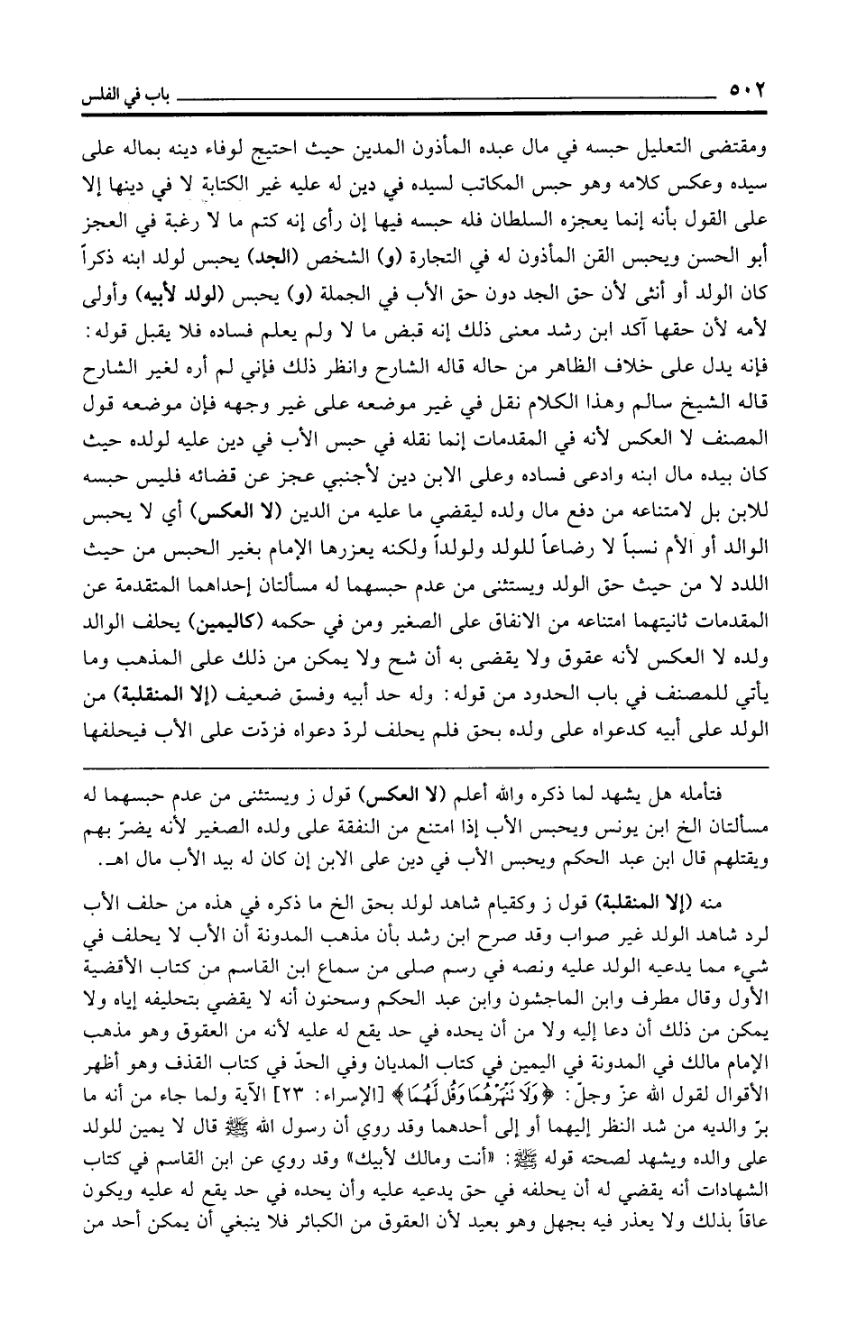 ومقتضى التعليل حبسه في مال عبده المأذون المدين حيث احتيج لوفاء دينه بماله على سيده وعكس كلامه وهو حبس المكاتب لسيده في دين له عليه غير الكتابة لا في دينها إلا على القول بأنه إنما يعجزه السلطان فله حبسه فيها إن رأى إنه كتم ما لا رغبة في العجز أبو الحسن ويحبس القن المأذون له في التجارة (و) الشخص (الجد) يحبس لولد ابنه ذكرًا كان الولد أو أنثى لأن حق الجد دون حق الأب في الجملة (و) يحبس (لولد لأبيه) وأولى لأمه لأن حقها آكد ابن رشد معنى ذلك إنه قبض ما لا ولم يعلم فساده فلا يقبل قوله: فإنه يدل على خلاف الظاهر من حاله قاله الشارح وانظر ذلك فإني لم أره لغير الشارح قاله الشيخ سالم وهذا الكلام نقل في غير موضعه على غير وجهه فإن موضعه قول المصنف لا العكس لأنه في المقدمات إنما نقله في حبس الأب في دين عليه لولده حيث كان بيده مال ابنه وادعى فساده وعلى الابن دين لأجنبي عجز عن قضائه فليس حبسه للابن بل لامتناعه من دفع مال ولده ليقضي ما عليه من الدين (لا العكس) أي لا يحبس الوالد أو الأم نسبًا لا رضاعًا للولد ولولدًا ولكنه يعزرها الإِمام بغير الحبس من حيث اللدد لا من حيث حق الولد ويستثنى من عدم حبسهما له مسألتان إحداهما المتقدمة عن المقدمات ثانيتهما امتناعه من الإنفاق على الصغير ومن في حكمه (كاليمين) يحلف الوالد ولده لا العكس لأنه عقوق ولا يقضى به أن شح ولا يمكن من ذلك على المذهب وما يأتي للمصنف في باب الحدود من قوله: وله حد أبيه وفسق ضعيف (إلا المنقلبة) من الولد على أبيه كدعواه على ولده بحق فلم يحلف لردّ دعواه فزدّت على الأب فيحلفها