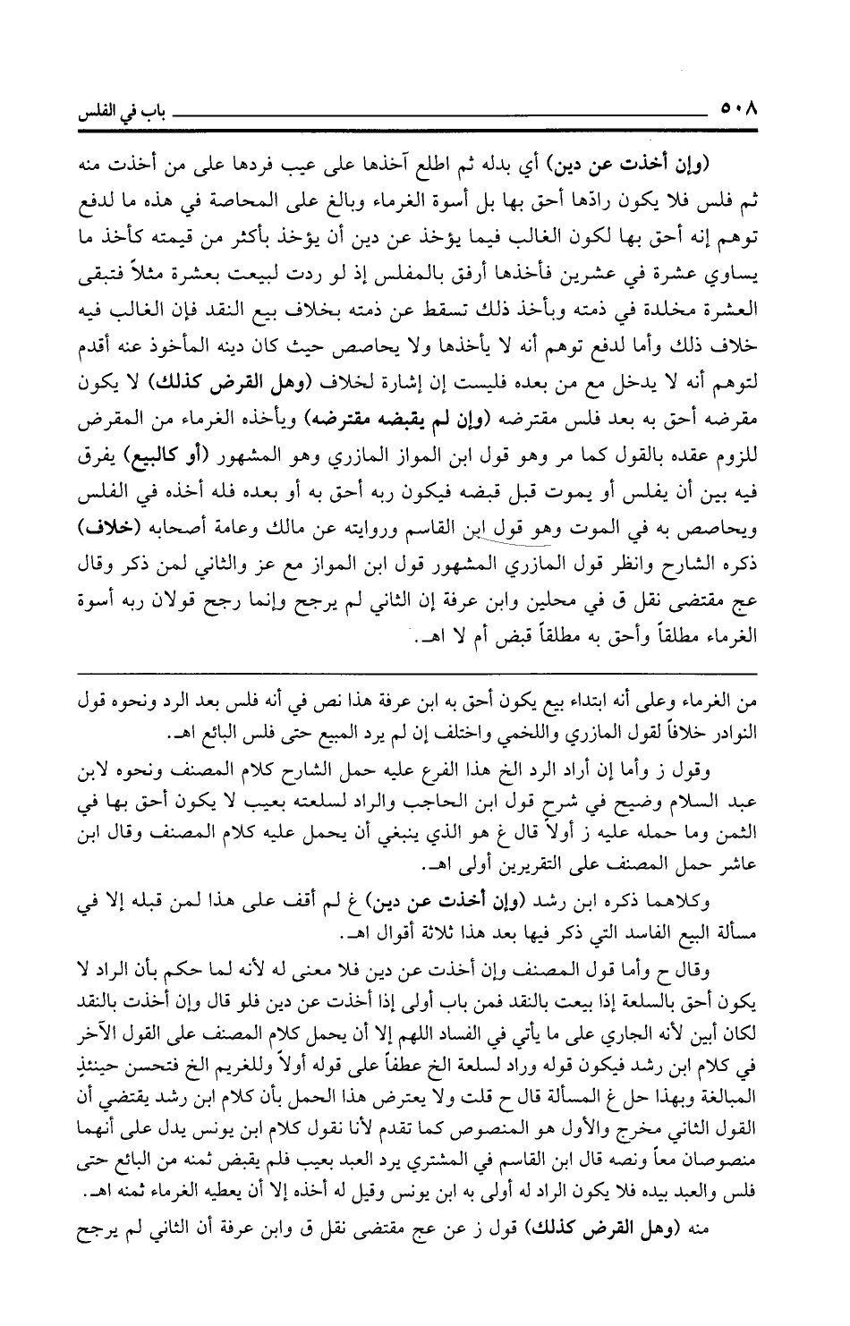 (وإن أخذت عن دين) أي بدله ثم اطلع آخذها على عيب فردها على من أخذت منه ثم فلس فلا يكون رادّها أحق بها بل أسوة الغرماء وبالغ على المحاصة في هذه ما لدفع توهم إنه أحق بها لكون الغالب فيما يؤخذ عن دين أن يؤخذ بأكثر من قيمته كأخذ ما يساوي عشرة في عشرين فأخذها أرفق بالمفلس إذ لو ردت لبيعت بعشرة مثلًا فتبقى العشرة مخلدة في ذمته وبأخذ ذلك تسقط عن ذمته بخلاف بيع النقد فإن الغالب فيه خلاف ذلك وأما لدفع توهم أنه لا يأخذها ولا يحاصص حيث كان دينه المأخوذ عنه أقدم لتوهم أنه لا يدخل مع من بعده فليست إن إشارة لخلاف (وهل القرض كذلك) لا يكون مقرضه أحق به بعد فلس مقترضه (وإن لم يقبضه مقترضه) ويأخذه الغرماء من المقرض للزوم عقده بالقول كما مر وهو قول ابن المواز المازري وهو المشهور (أو كالبيع) يفرق فيه بين أن يفلس أو يموت قبل قبضه فيكون ربه أحق به أو بعده فله أخذه في الفلس ويحاصص به في الموت وهو قول ابن القاسم وروايته عن مالك وعامة أصحابه (خلاف) ذكره الشارح وانظر قول المازري المشهور قول ابن المواز مع عز والثاني لمن ذكر وقال عج مقتضى نقل ق في محلين وابن عرفة إن الثاني لم يرجح وإنما رجح قولان ربه أسوة الغرماء مطلقًا وأحق به مطلقًا قبض أم لا اهـ.